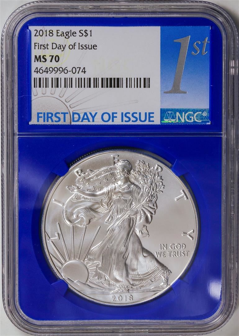 One 2018 American Silver Eagle .999 Fine Silver Dollar Coin NGC MS70.