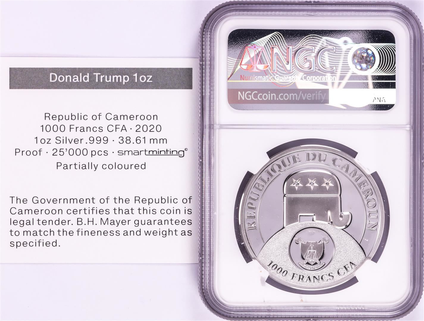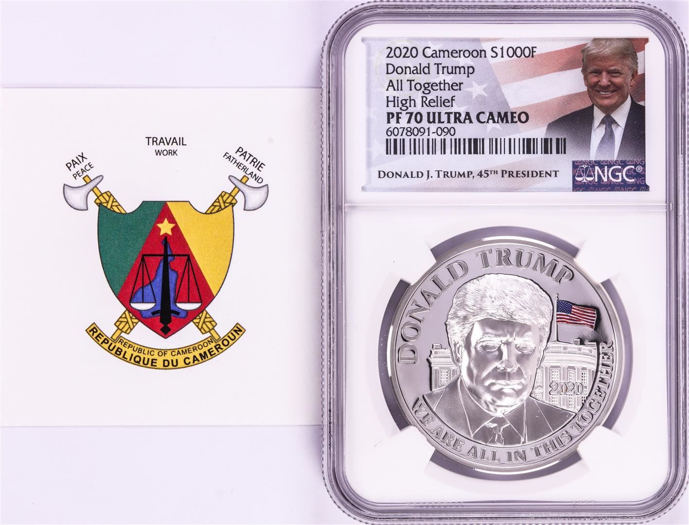 One 2020 Cameroon S1000F Donald Trump All Together High Relief PF 70 Ultra Cameo 1oz Silver .999 Coin.