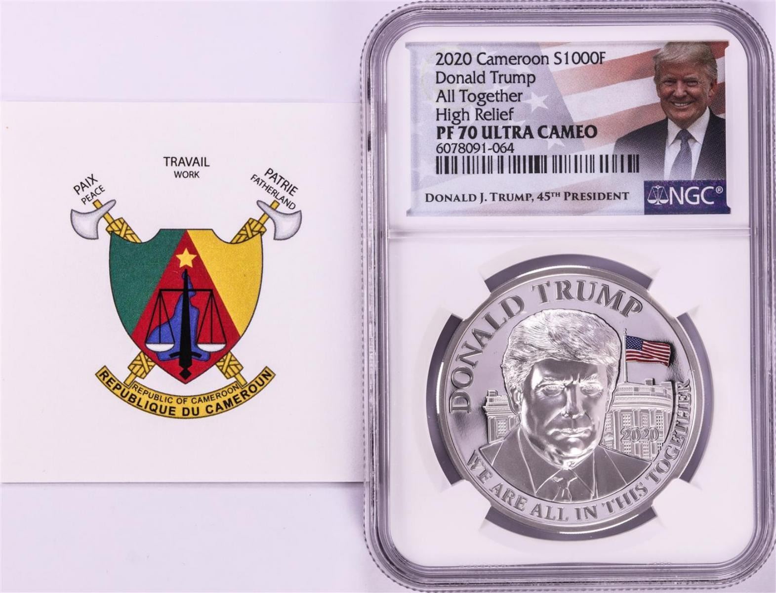 One 2020 Cameroon S1000F Donald Trump All Together High Relief PF 70 Ultra Cameo 1oz Silver .999 Coin.