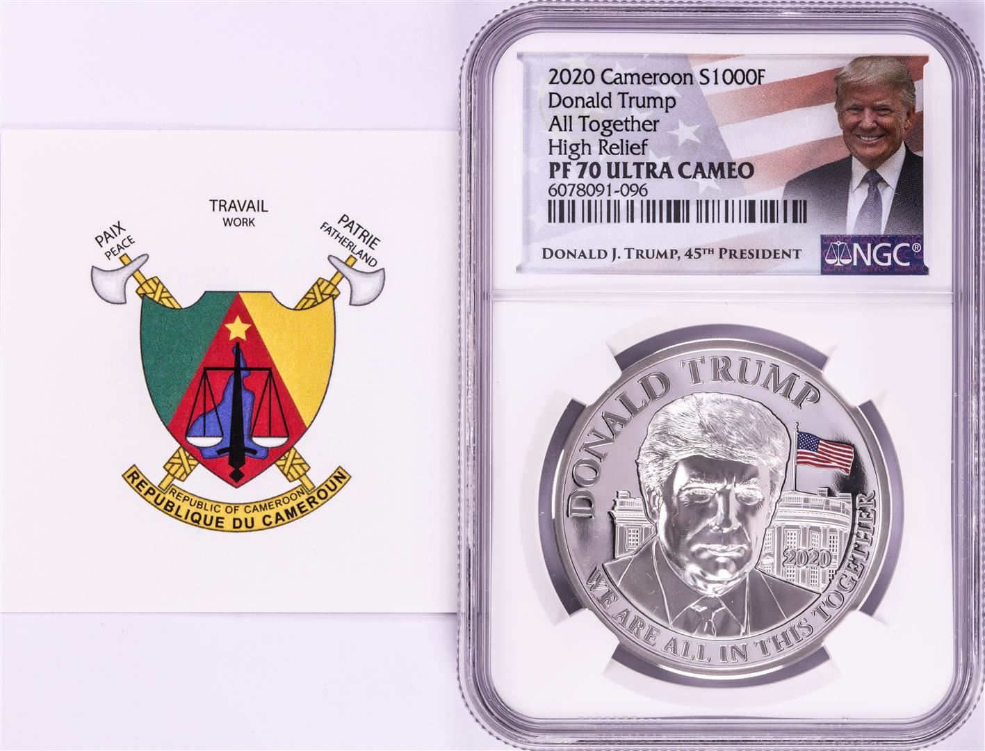 One 2020 Cameroon S1000F Donald Trump All Together High Relief PF 70 Ultra Cameo 1oz Silver .999 Coin.