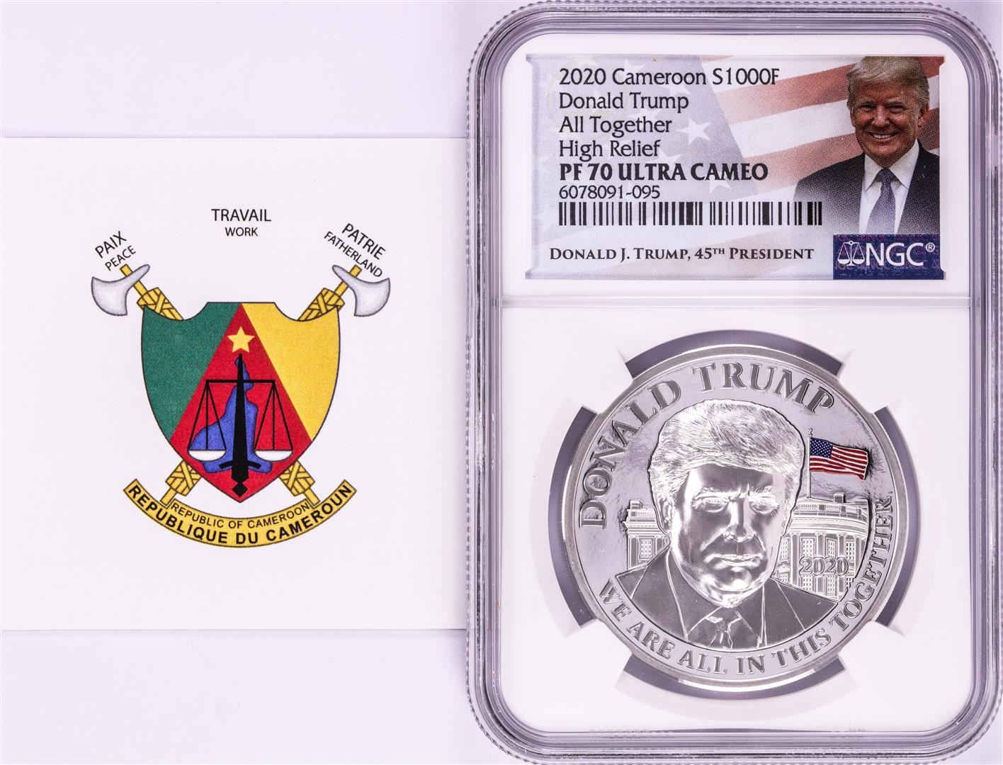 One 2020 Cameroon S1000F Donald Trump All Together High Relief PF 70 Ultra Cameo 1oz Silver .999 Coin.
