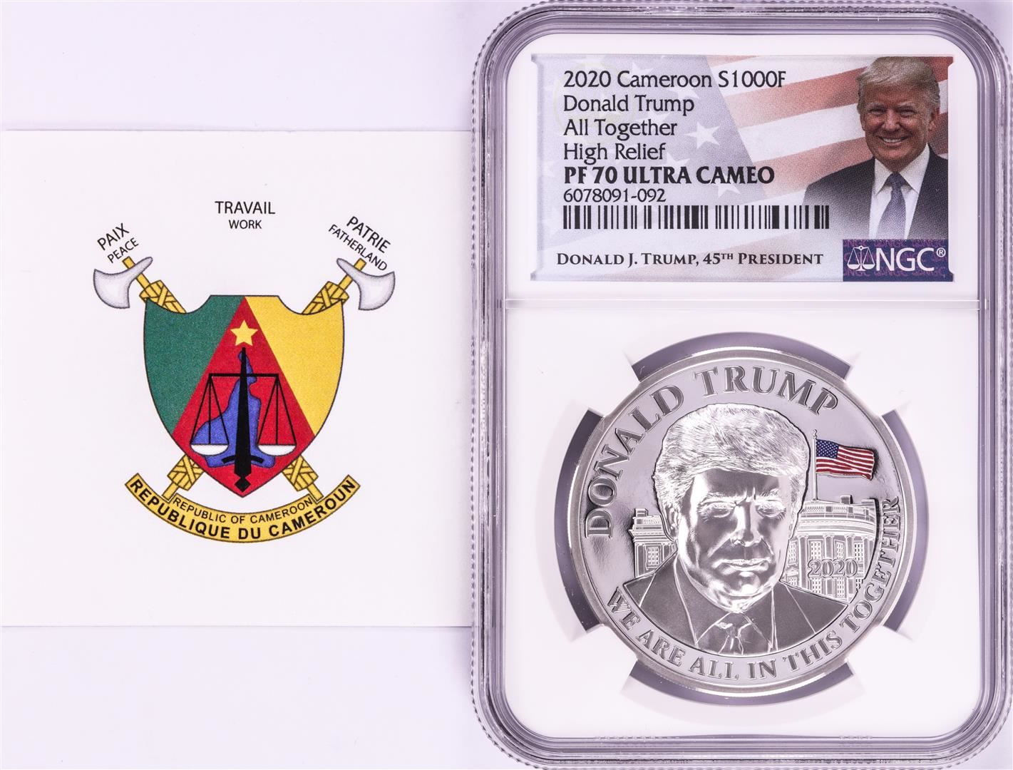 One 2020 Cameroon S1000F Donald Trump All Together High Relief PF 70 Ultra Cameo 1oz Silver .999 Coin.
