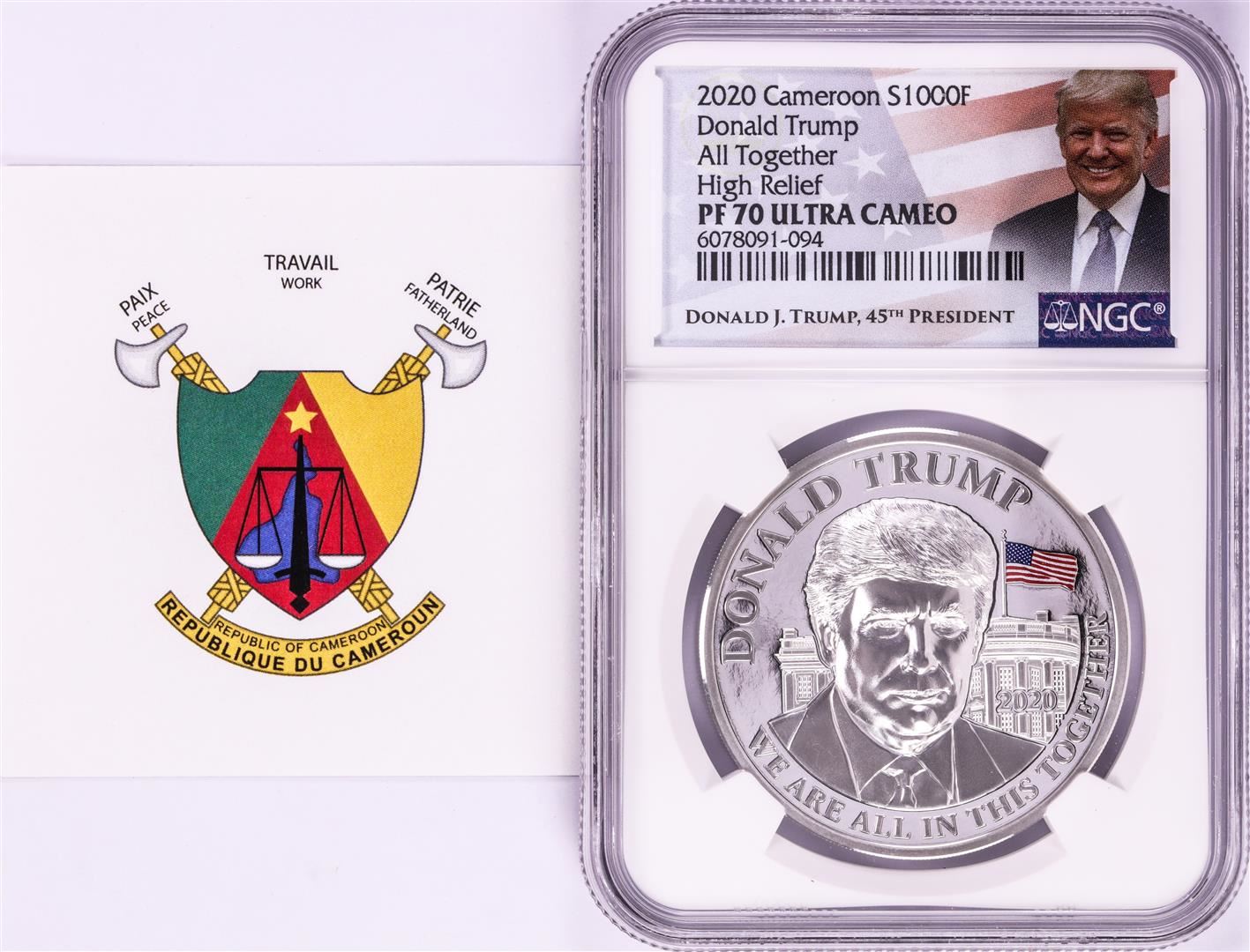 One 2020 Cameroon S1000F Donald Trump All Together High Relief PF 70 Ultra Cameo 1oz Silver .999 Coin.