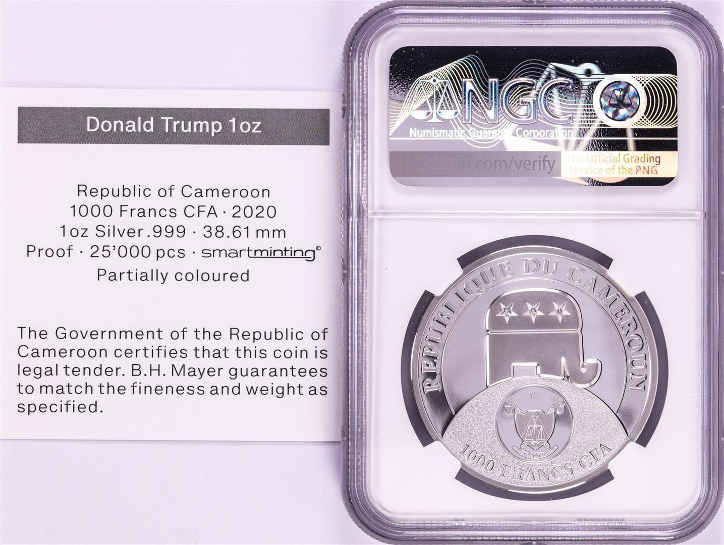 One 2020 Cameroon S1000F Donald Trump All Together High Relief PF 70 Ultra Cameo 1oz Silver .999 Coin.
