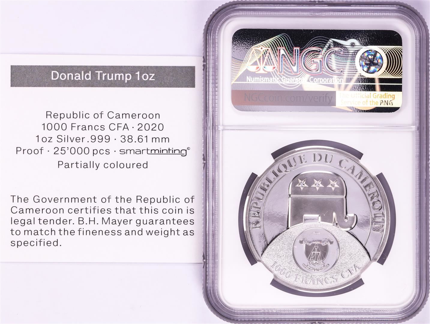 One 2020 Cameroon S1000F Donald Trump All Together High Relief PF 70 Ultra Cameo 1oz Silver .999 Coin.