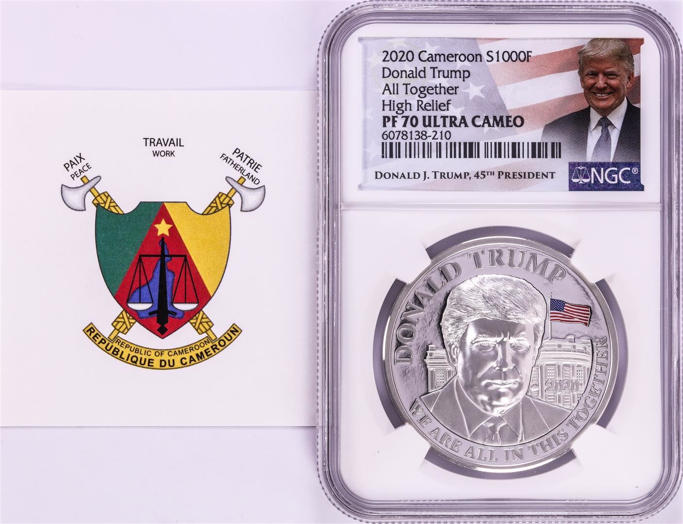 One 2020 Cameroon S1000F Donald Trump All Together High Relief PF 70 Ultra Cameo 1oz Silver .999 Coin.