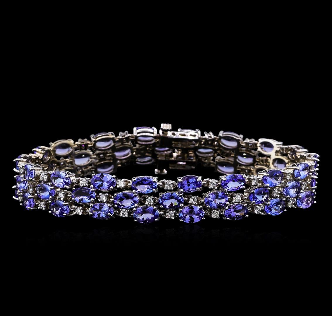One electronically tested 14KT white gold lady's combination cast & assembled fashion bracelet with a tongue clasp with a bright polish finish. The featured lady's bracelet measures approximately 7.75 inches long. Condition is new, good workmanship. Containing: Fifty-four prong set oval modified brilliant cut natural tanzanites, measuring 5.90 x 3.75 x 2.50mm, approximate total weight of 21.20ct., clarity is eye clean, type I, medium light, very slightly grayish, bluish violet color, (GIA bV 4/3), cut is good. Transmitting light with no distortion, transparent. Colored gemstones are presumed to have been subjected to commonly used enhancement processes. Graded in the setting. Fifty-Four prong set round brilliant cut diamonds, measuring 1.90 - 1.80 x 1.15mm (depth est.) approximate total weight of 54 Stones = 1.30ct. Graded in the setting. Clarity: VS-2 to SI-2. Color: H - I. Cut Good. Total Weight of Colored Stones 21.20ct. Total Weight of Diamonds 1.30ct. Total Weight of Bracelet 26.30gm. GAS Appraised at $26,280.00.