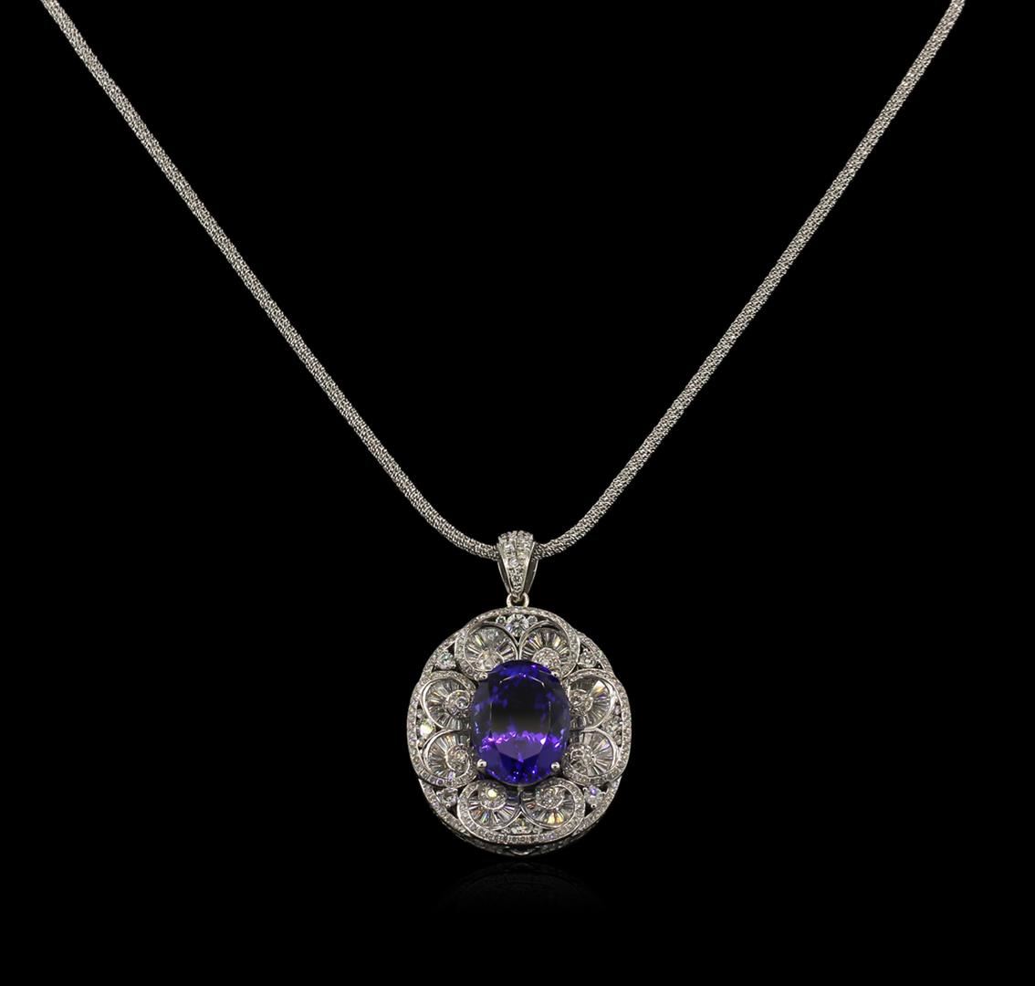 One electronically tested 14KT white gold lady's combination cast & assembled fashion pendant & chain 18.0" long, 2.05mm twisted rope chain with a lobster claw clasp with a bright polish finish. Identified with markings of "14K". Condition is new, good workmanship. Containing: One prong set oval modified brilliant cut natural tanzanite, measuring 19.00 x 14.34 x 10.77mm, 5% bulge factor, approximate weight of 21.34ct., clarity is eye clean, type I, dark, violet color, (GIA V 7/0), cut is very good. Transmitting light with no distortion, transparent. Colored gemstones are presumed to have been subjected to commonly used enhancement processes. Graded loose prior to setting in the GIA Laboratory, Report #2175177285.Four round brilliant cut diamonds, measuring 3.55 - 3.50 x 2.12mm (depth est.) approximate total weight of 4 Stones = 0.64ct. Graded in the setting. Four prong set round brilliant cut diamonds, measuring 2.60 - 2.50 x 1.53mm (depth est.) approximate total weight of 4 Stones = 0.25ct. Graded in the setting. Clarity: VS-2 to SI-1. Color: G - H. Cut Good Twenty-Six prong set round brilliant cut diamonds, measuring 1.70 - 1.50 x 0.96mm (depth est.) approximate total weight of 26 Stones = 0.40ct. Graded in the setting. Clarity: VS-2 to SI-1. Color: G - Good One Hundred Eighty-Eight prong set round brilliant cut diamonds, measuring 1.25 - 1.20 x 0.74mm (depth est.) approximate total weight of 188 Stones = 1.26ct. Graded in the setting. Clarity: VS-2 to SI-1. Color: G - Good Eighty-Seven channel set baguette cut (tapered) diamonds, measuring from 1.65 x 1.00 x 0.85mm (depth est.) to 3.00 x 2.00 x 1.71mm (depth est.) approximate total weight of 87 Stones = 3.55ct. Graded in the setting. Clarity: VS-1 to VS-2. Color: G - Very Good Fifty-Two bead set round brilliant cut diamonds, measuring 1.00 - 0.95 x 0.64mm (depth est.) approximate total weight of 52 Stones = 0.20ct. Graded in the setting. Clarity: VS-2 to SI-1. Color: G - Good. Total Weight of Colored Stones 21.34ct. Total Weight of Diamonds 6.30ct. Total Weight of Pendant & Chain 34.00gm. GAS Appraised at $57,990.00.