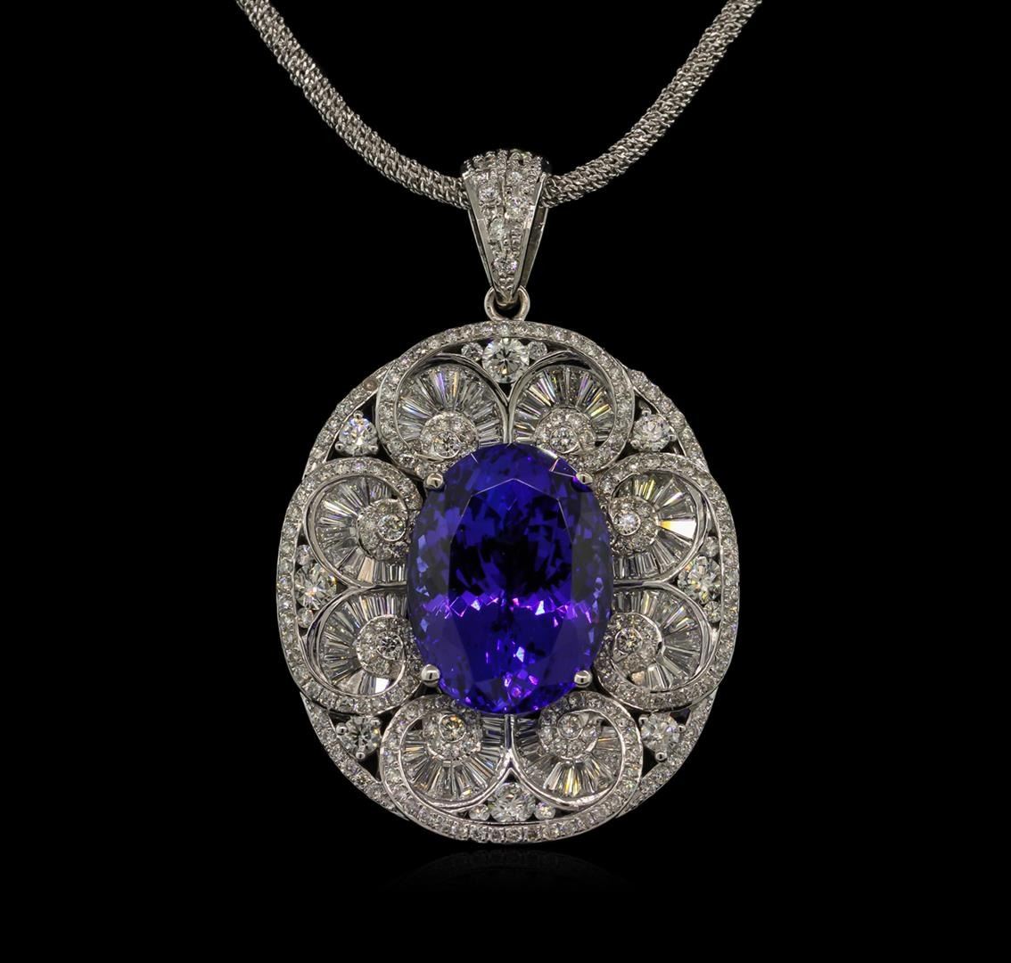 One electronically tested 14KT white gold lady's combination cast & assembled fashion pendant & chain 18.0" long, 2.05mm twisted rope chain with a lobster claw clasp with a bright polish finish. Identified with markings of "14K". Condition is new, good workmanship. Containing: One prong set oval modified brilliant cut natural tanzanite, measuring 19.00 x 14.34 x 10.77mm, 5% bulge factor, approximate weight of 21.34ct., clarity is eye clean, type I, dark, violet color, (GIA V 7/0), cut is very good. Transmitting light with no distortion, transparent. Colored gemstones are presumed to have been subjected to commonly used enhancement processes. Graded loose prior to setting in the GIA Laboratory, Report #2175177285.Four round brilliant cut diamonds, measuring 3.55 - 3.50 x 2.12mm (depth est.) approximate total weight of 4 Stones = 0.64ct. Graded in the setting. Four prong set round brilliant cut diamonds, measuring 2.60 - 2.50 x 1.53mm (depth est.) approximate total weight of 4 Stones = 0.25ct. Graded in the setting. Clarity: VS-2 to SI-1. Color: G - H. Cut Good Twenty-Six prong set round brilliant cut diamonds, measuring 1.70 - 1.50 x 0.96mm (depth est.) approximate total weight of 26 Stones = 0.40ct. Graded in the setting. Clarity: VS-2 to SI-1. Color: G - Good One Hundred Eighty-Eight prong set round brilliant cut diamonds, measuring 1.25 - 1.20 x 0.74mm (depth est.) approximate total weight of 188 Stones = 1.26ct. Graded in the setting. Clarity: VS-2 to SI-1. Color: G - Good Eighty-Seven channel set baguette cut (tapered) diamonds, measuring from 1.65 x 1.00 x 0.85mm (depth est.) to 3.00 x 2.00 x 1.71mm (depth est.) approximate total weight of 87 Stones = 3.55ct. Graded in the setting. Clarity: VS-1 to VS-2. Color: G - Very Good Fifty-Two bead set round brilliant cut diamonds, measuring 1.00 - 0.95 x 0.64mm (depth est.) approximate total weight of 52 Stones = 0.20ct. Graded in the setting. Clarity: VS-2 to SI-1. Color: G - Good. Total Weight of Colored Stones 21.34ct. Total Weight of Diamonds 6.30ct. Total Weight of Pendant & Chain 34.00gm. GAS Appraised at $57,990.00.