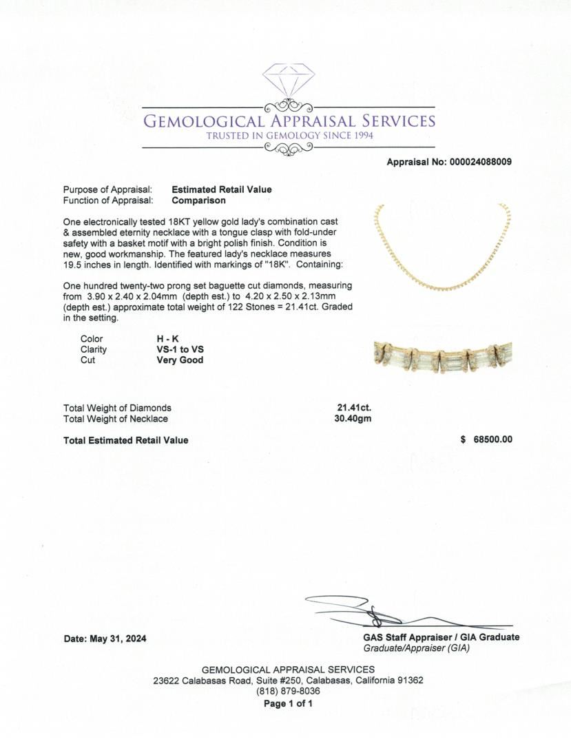 Make an unforgettable statement with this breathtaking 18KT yellow gold eternity necklace. Featuring a polished finish, basket motif, and tongue clasp with fold-under safety, this 19.5-inch necklace showcases 122 prong-set baguette cut diamonds totaling 21.41 carats, graded VS-1 to VS in clarity and H-K in color. This elegant piece is crafted to impress and elevate any formal attire.