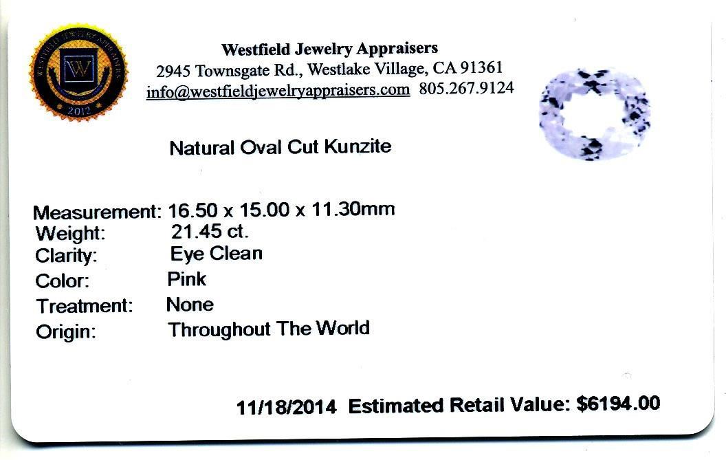 21.45ctw. Natural Oval Cut Kunzite. Westfield Appraised at $6,194.00.