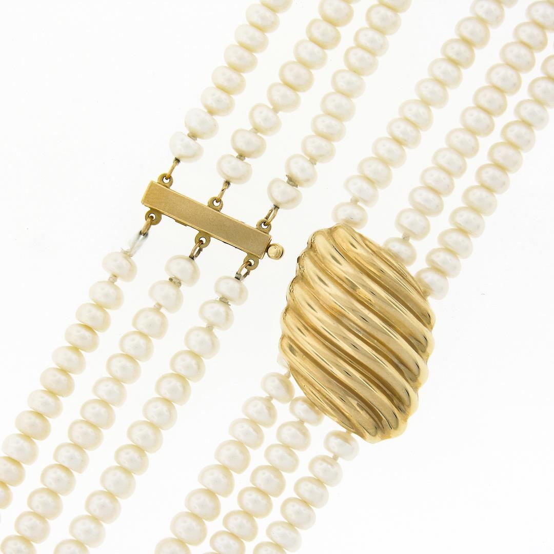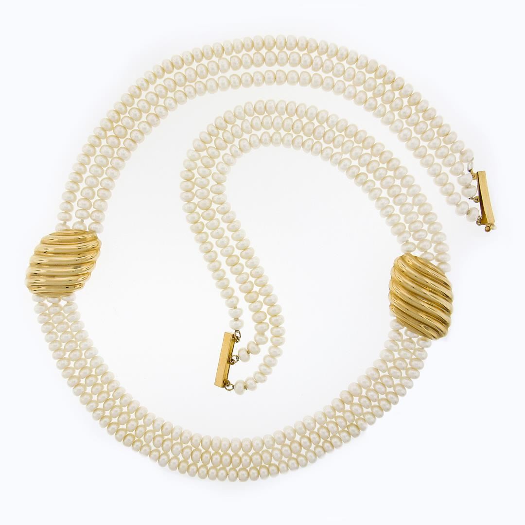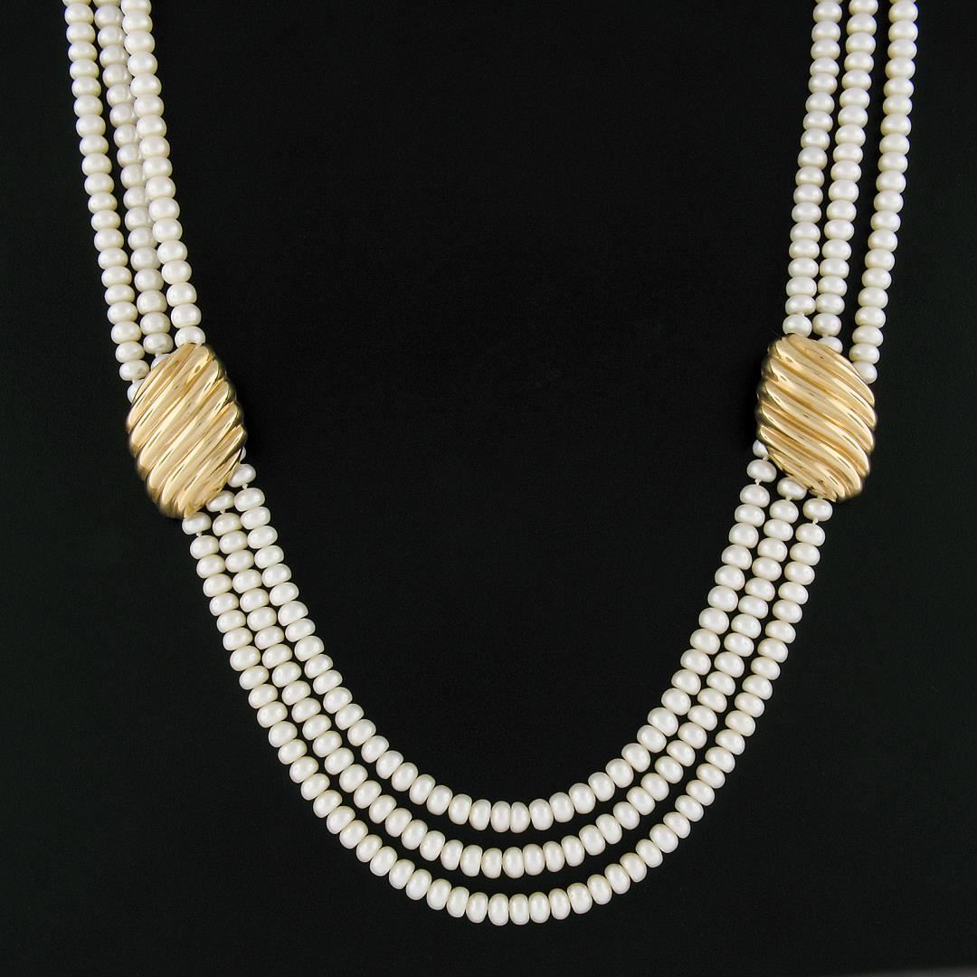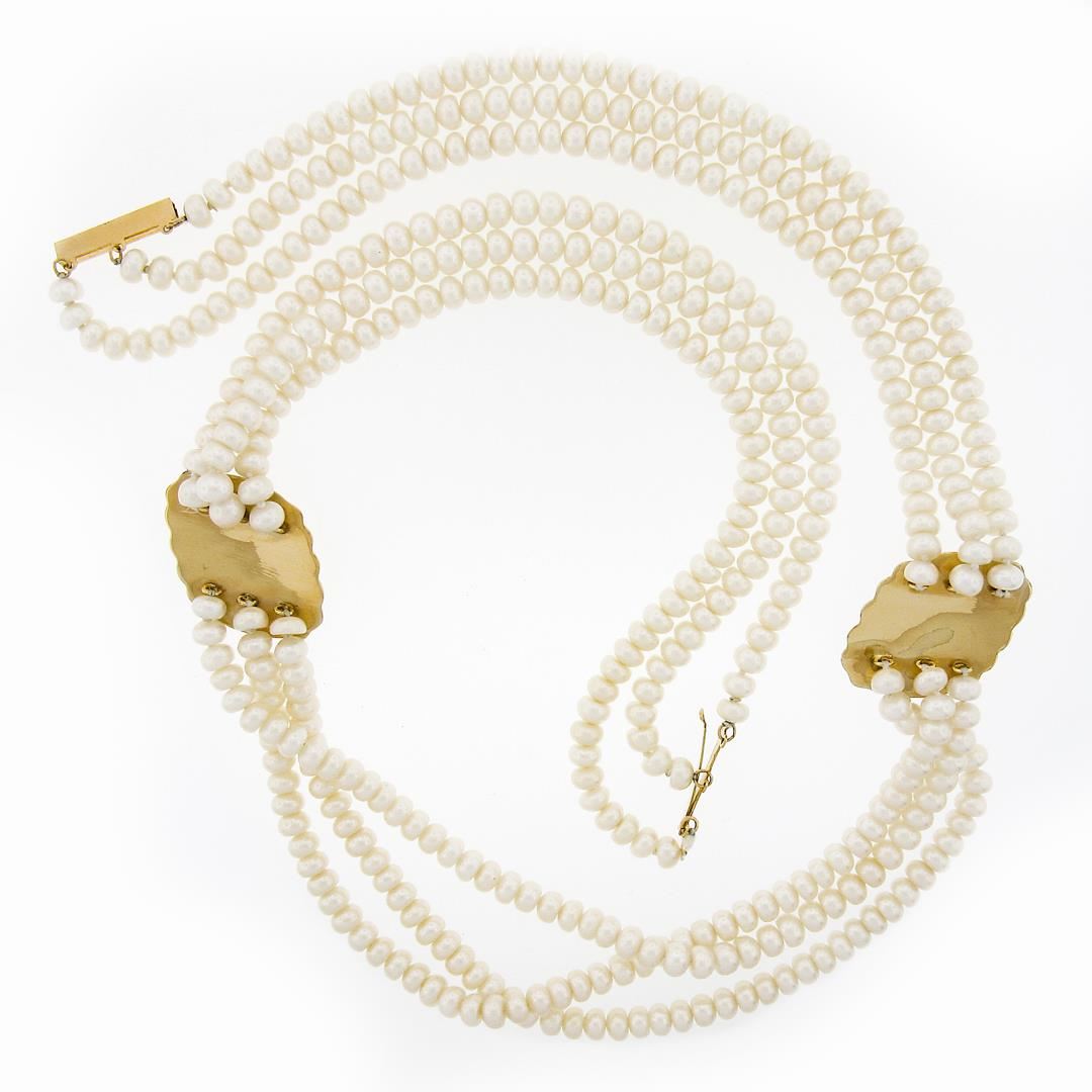 A 3 row strand necklace with solid 14k yellow gold stations and clasp, with numeroud of semi round cultured pearls (5mm to 5.25mm each). It weighs a total of 73.48 grams, measures 21.3mm wide, and measures 21.5 inches in length.