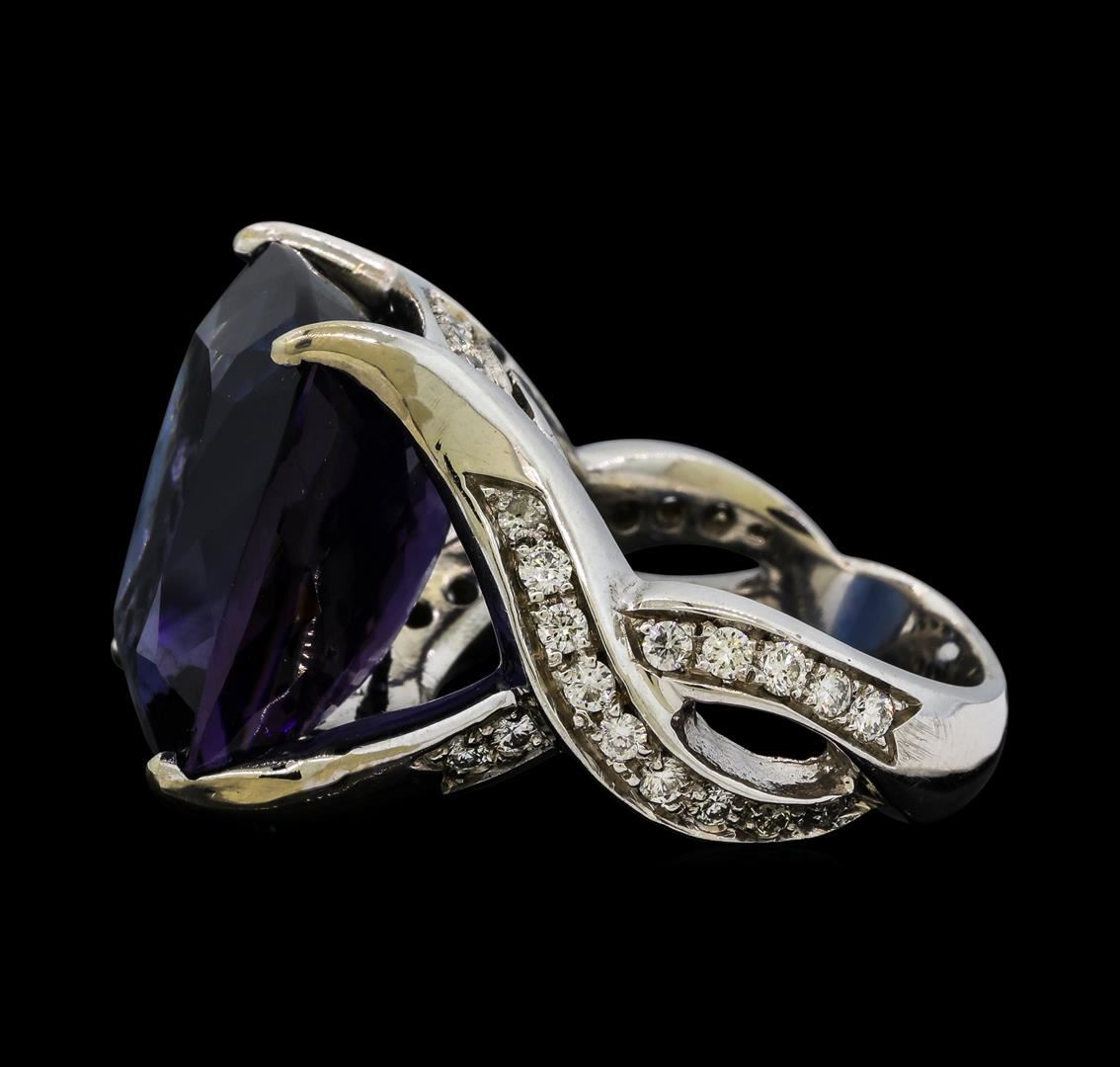 One electronically tested 14KT white gold lady's cast fashion ring with a split crossover shank with a bright polish finish. The featured lady's ring has a shank measuring 4.14 millimeters wide. Identified with markings of '14K'. Condition is new, good workmanship. Containing: One prong set rectangular cushion modified brilliant cut natural tanzanite, measuring 17.40 x 15.03 x 9.91mm, (depth est.) 6%. bulge factor, approximate weight of 21.63ct., clarity is eye clean, dark, strong, violetish blue color, (GIA vB 7/5), cut is very good. The featured tanzanite has moderate green undertones. Transmitting light with no distortion, transparent. Colored gemstones are presumed to have been subjected to commonly used enhancement processes. Graded in the setting. Thirty-Five bead set round brilliant cut diamonds, measuring 1.80 - 1.75 x 1.10mm (depth est.) approximate total weight of 35 Stones = 0.74ct. Graded in the setting. Clarity SI-1 to SI-2. Color: G - H Cut Good Four prong set round brilliant cut diamonds, measuring 1.50 - 1.30 x 0.84mm (depth est.) approximate total weight of 4 Stones = 0.04ct. Graded in the setting. Clarity SI-1 to SI-2. Color: H - I Cut Good. Total Weight of Colored Stones 21.63ct.. Total Weight of Diamonds 0.78ct.. Total Weight of Ring 16.10gm. GAS Appraised at $23,165.00.