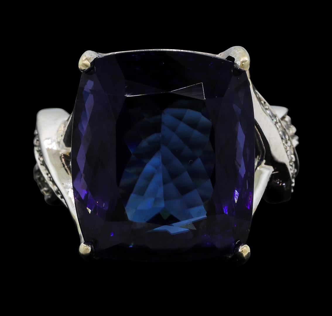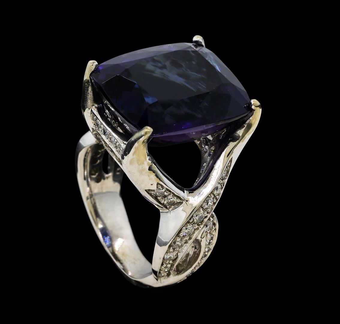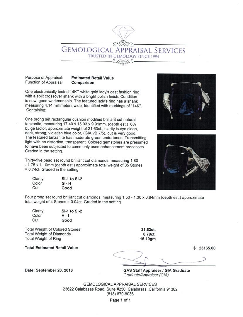 One electronically tested 14KT white gold lady's cast fashion ring with a split crossover shank with a bright polish finish. The featured lady's ring has a shank measuring 4.14 millimeters wide. Identified with markings of '14K'. Condition is new, good workmanship. Containing: One prong set rectangular cushion modified brilliant cut natural tanzanite, measuring 17.40 x 15.03 x 9.91mm, (depth est.) 6%. bulge factor, approximate weight of 21.63ct., clarity is eye clean, dark, strong, violetish blue color, (GIA vB 7/5), cut is very good. The featured tanzanite has moderate green undertones. Transmitting light with no distortion, transparent. Colored gemstones are presumed to have been subjected to commonly used enhancement processes. Graded in the setting. Thirty-Five bead set round brilliant cut diamonds, measuring 1.80 - 1.75 x 1.10mm (depth est.) approximate total weight of 35 Stones = 0.74ct. Graded in the setting. Clarity SI-1 to SI-2. Color: G - H Cut Good Four prong set round brilliant cut diamonds, measuring 1.50 - 1.30 x 0.84mm (depth est.) approximate total weight of 4 Stones = 0.04ct. Graded in the setting. Clarity SI-1 to SI-2. Color: H - I Cut Good. Total Weight of Colored Stones 21.63ct.. Total Weight of Diamonds 0.78ct.. Total Weight of Ring 16.10gm. GAS Appraised at $23,165.00.