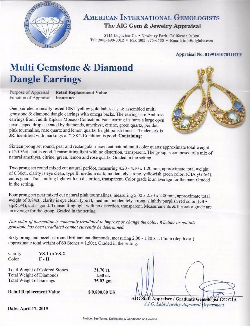 One pair electronically tested 18KT yellow gold ladies cast & assembled multi gemstone & diamond dangle earrings with omega back. The earrings are Ambrosia earrings from Judith Ripka's Monaco Collection. Each earring features a large open pear shaped drop accented by diamonds, amethyst, citrine, green quartz, peridot, pink tourmaline, rose quartz and lemon quartz. Bright polish finish. Trademark is JR. Identified with markings of "18K". Condition is good. Containing: Sixteen prong set round, pear and rectangular mixed cut natural multi color quartz approximate total weight of 20.56ct., cut is good. Transmitting light with no distortion, transparent. The group is composed of a mix of natural amethyst, citrine, green, lemon and rose quartz. Graded in the setting. Two prong set round mixed cut natural peridot, measuring 4.20 - 4.10 x 1.20 mm, approximate total weight of 0.30ct., clarity is eye clean, type II, medium dark, moderately strong, yellowish green color, (GIA yG 6/4), cut is good. Transmitting light with no distortion, transparent. Color grade is an average for the pair. Graded in the setting. Fur prong set pear mixed cut natural pink tourmalines, measuring 5.00 x 2.50 x 2.80mm, approximate total weight of 0.84ct., clarity is eye clean, type II, medium, moderately strong, slightly purplish red color, (GIA slpR 5/4), cut is good. Transmitting light with no distortion, transparent. Measurements & the color grade are an average for the group. Graded in the setting. This color of tourmaline is commonly irradiated to improve or change the color. Whether or not this gemstone has been irradiated cannot currently be determined. Sixty prong and bezel set round brilliant cut diamonds, measuring 2.00 - 1.80 x 1.14mm (depth est.) approximate total weight of 60 Stones = 1.50ct. Graded in the setting. Clarity: VS-1 to VS-2. Color: F - H. Total Weight of Colored Stones: 21.70 ct. Total Weight of Diamonds: 1.50 ct. Total Weight of Earrings: 35.03 gm. AIG Appraised at $9,800.00.