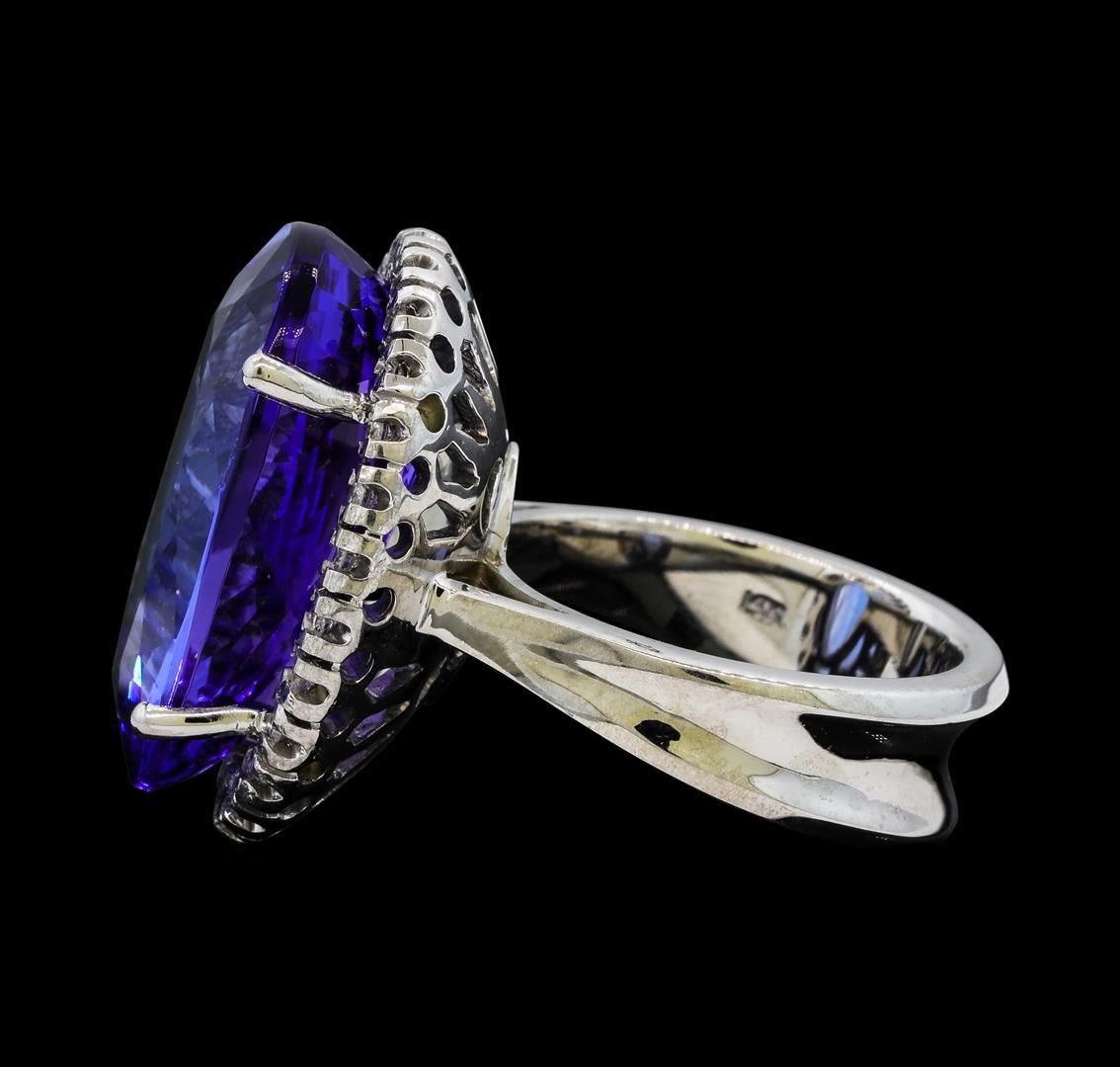 One electronically tested 14KT white gold lady's cast fashion ring with a basket halo with a bright polish finish. The featured lady's ring has a shank measuring 7.15 millimeters wide. Identified with markings of '14K'. Condition is new, good workmanship. Containing: One prong set oval modified brilliant cut natural tanzanite, measuring 22.10 x 14.26 x 8.30mm, (depth est.) 15%. bulge factor, approximate weight of 21.30ct., clarity is eye clean, medium, moderately strong, violetish blue color, (GIA vB 5/4), cut is fair. Transmitting light with no distortion, transparent. Colored gemstones are presumed to have been subjected to commonly used enhancement processes. Graded in the setting. Twenty-Six prong set round brilliant cut diamonds, measuring 1.80 - 1.70 x 1.05mm (depth est.) approximate total weight of 26 Stones = 0.50ct. Graded in the setting. Clarity SI-1 to I-1. Color: H - I Cut Good. Total Weight of Colored Stones 21.30ct.. Total Weight of Diamonds 0.50ct.. Total Weight of Ring 14.90gm. GAS Appraised at $21,005.00.