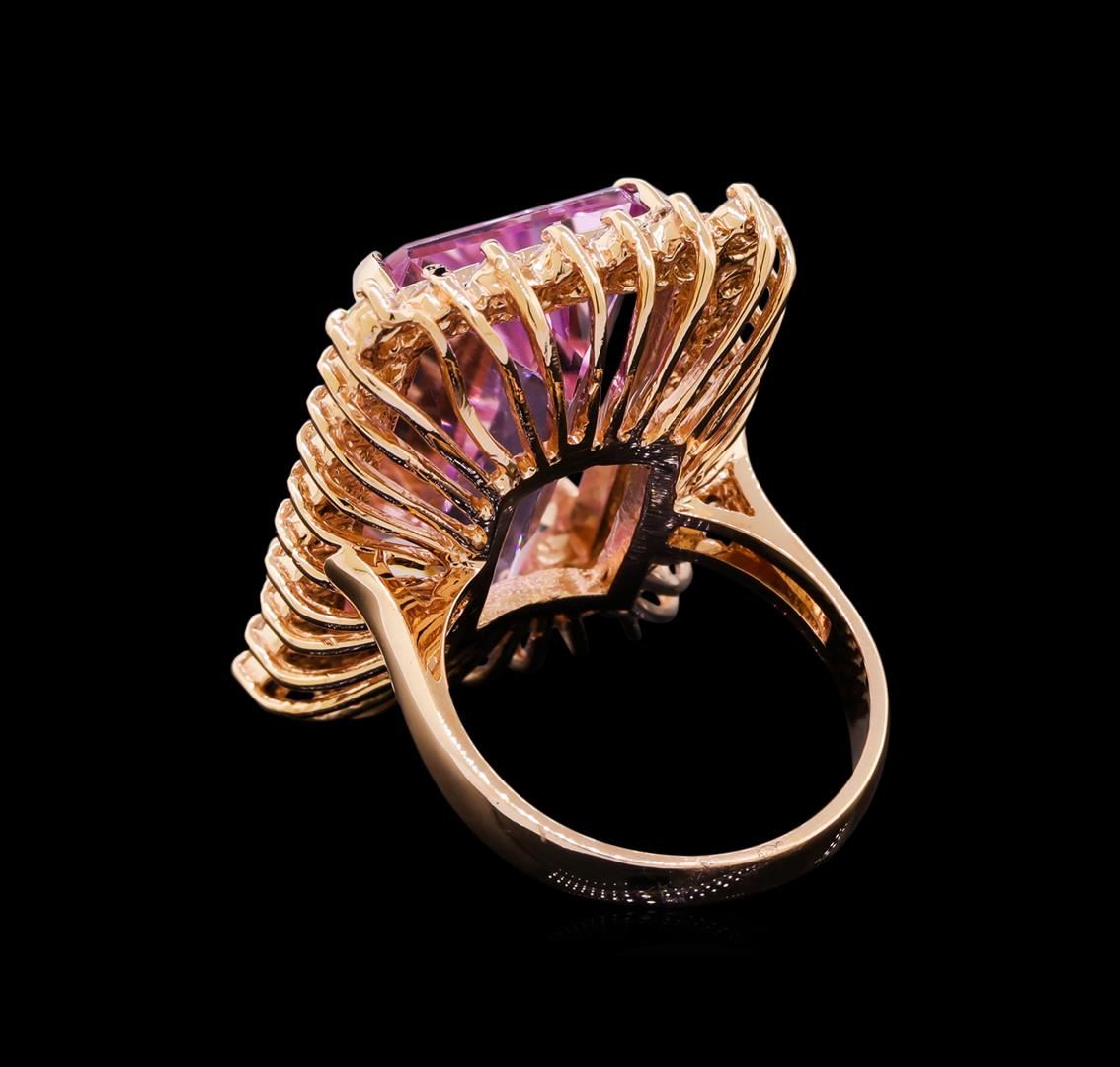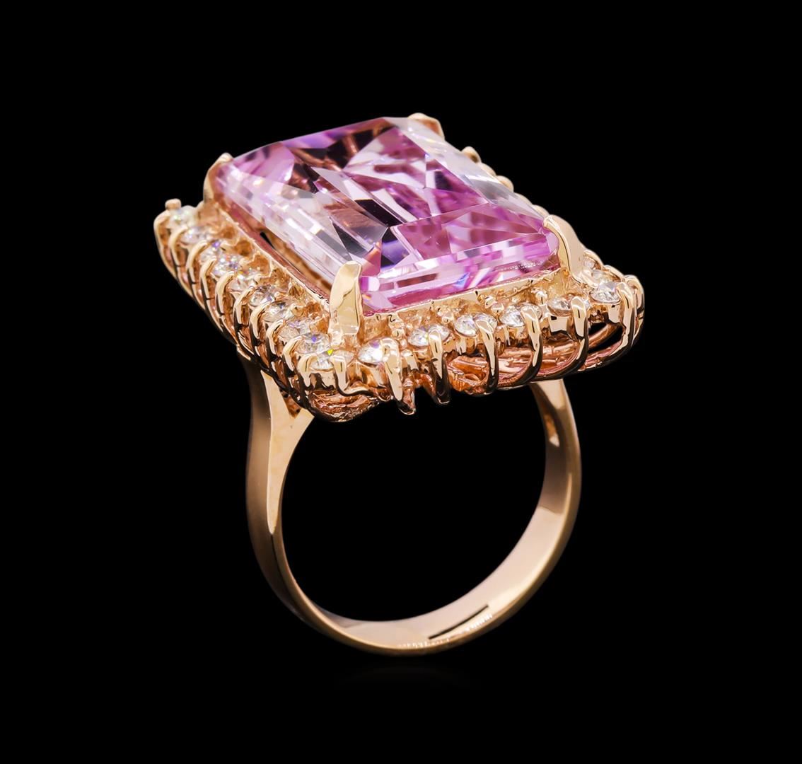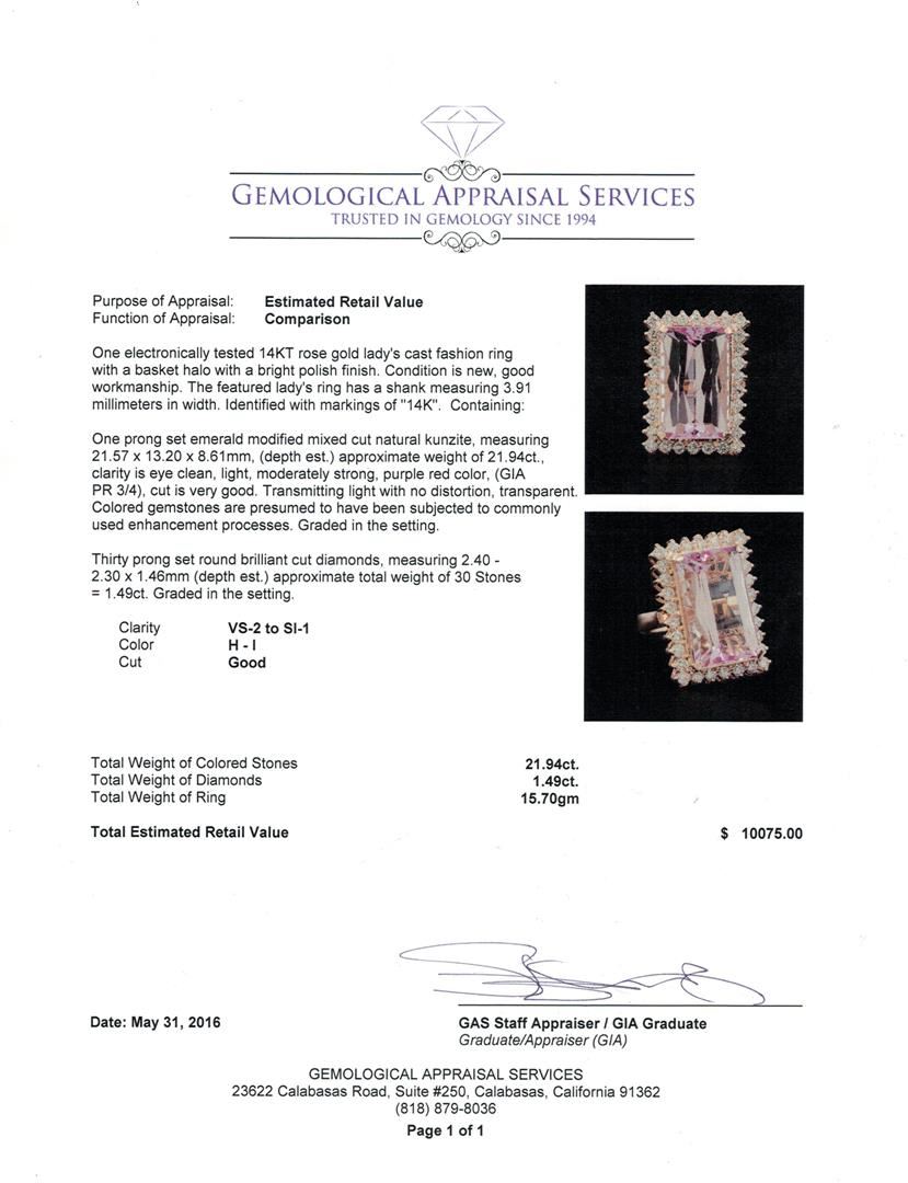 One electronically tested 14KT rose gold lady's cast fashion ring with a basket halo with a bright polish finish. The featured lady's ring has a shank measuring 3.91 millimeters in width. Identified with markings of "14K". Condition is new, good workmanship. Containing: One prong set emerald modified mixed cut natural kunzite, measuring 21.57 x 13.20 x 8.61mm, (depth est.) approximate weight of 21.94ct., clarity is eye clean, light, moderately strong, purple red color, (GIA PR 3/4), cut is very good. Transmitting light with no distortion, transparent. Colored gemstones are presumed to have been subjected to commonly used enhancement processes. Graded in the setting. Thirty prong set round brilliant cut diamonds, measuring 2.40 - 2.30 x 1.46mm (depth est.) approximate total weight of 30 Stones = 1.49ct. Graded in the setting. Clarity: VS-2 to SI-1. Color: H - I. Cut Good. Total Weight of Colored Stones 21.94ct. Total Weight of Diamonds 1.49ct. Total Weight of Ring 15.70gm. GAS Appraised at $10,075.00.