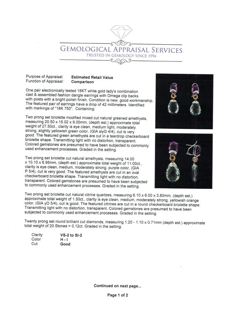 One pair electronically tested 18KT white gold lady's combination cast & assembled fashion dangle earrings with Omega clip backs with posts with a bright polish finish. The featured pair of earrings have a drop of 42 millimeters. Identified with markings of '18K 750'. Condition is new, good workmanship. Containing: Two prong set briolette modified mixed cut natural greened amethysts, measuring 20.50 x 15.02 x 9.00mm, (depth est.) approximate total weight of 27.50ct., clarity is eye clean, medium light, moderately strong, slightly yellowish green color, (GIA slyG 4/4), cut is very good. Two prong set briolette cut natural amethysts, measuring 14.00 x 10.10 x 6.95mm, (depth est.) approximate total weight of 11.00ct., clarity is eye clean, medium, moderately strong, purple color, (GIA P 5/4), cut is very good. Two prong set briolette cut natural citrine quartzes, measuring 6.10 x 6.00 x 3.80mm, (depth est.) approximate total weight of 1.50ct., clarity is eye clean, medium, moderately strong, yellowish orange color, (GIA yO 5/4), cut is good. Twenty prong set round brilliant cut diamonds, measuring 1.20 - 1.10 x 0.71mm (depth est.) approximate total weight of 20 Stones = 0.12ct. Clarity VS-2 to SI-2. Color: H - I Cut Good. Total Weight of Earrings 15.60gm. One electronically tested 18KT white gold lady's combination cast & assembled gemstone eternity necklace with a tongue clasp with foldover safety with a bright polish finish. The featured lady's gemstone eternity necklace has ten connected sections of alternating amethyst and green amethyst that are separated by round briolette cut citrine spacers. The necklace measures approximately 17 inches in length with a drop of 51 millimeters. Identified with markings of "18K 750". Condition is new, good workmanship. Containing: One claw set briolette cut natural greened amethyst, measuring 22.00 x 16.80 x 10.40mm, (depth est.) approximate weight of 20.50ct., clarity is eye clean, medium light, moderately strong, slightly yellowish green color, (GIA slyG 4/4), cut is very good. One prong set briolette cut natural greened amethyst, measuring 19.10 x 18.40 x 11.61mm, (depth est.) approximate weight of 19.50ct., clarity is eye clean, medium light, moderately strong, slightly yellowish green color, (GIA slyG 4/4), cut is very good. Ten prong set briolette cut natural greened amethysts, measuring 14.00 x 10.10 x 6.95mm, (depth est.) approximate total weight of 55.00ct., clarity is eye clean, medium light, moderately strong, slightly yellowish green color, (GIA slyG 4/4), cut is very good. Eleven prong set briolette cut natural amethysts, measuring 14.00 x 10.10 x 6.95mm, (depth est.) approximate total weight of 61.25ct., clarity is eye clean, medium, moderately strong, purple color, (GIA P 5/4), cut is very good. Twenty-four prong set briolette modified mixed cut natural citrine quartzes, measuring 6.10 x 6.00 x 3.80mm, (depth est.) approximate total weight of 18.00ct., clarity is eye clean, medium, moderately strong, yellowish orange color, (GIA yO 5/4), cut is very good. One Hundred Thirty-Seven prong set round brilliant cut diamonds, measuring 1.20 - 1.10 x 0.71mm (depth est.) approximate total weight of 137 Stones = 0.80ct. Clarity: VS-2 to SI-2. Color: H - I. Cut: Good. Total Weight of Necklace 71.00gm. Colored gemstones are presumed to have been subjected to commonly used enhancement processes. See appraisal for more info. GAS Appraised at $19,525.00.