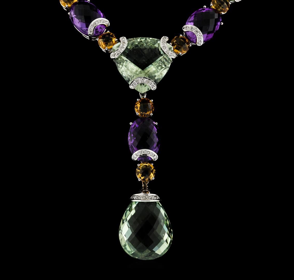 One pair electronically tested 18KT white gold lady's combination cast & assembled fashion dangle earrings with Omega clip backs with posts with a bright polish finish. The featured pair of earrings have a drop of 42 millimeters. Identified with markings of '18K 750'. Condition is new, good workmanship. Containing: Two prong set briolette modified mixed cut natural greened amethysts, measuring 20.50 x 15.02 x 9.00mm, (depth est.) approximate total weight of 27.50ct., clarity is eye clean, medium light, moderately strong, slightly yellowish green color, (GIA slyG 4/4), cut is very good. Two prong set briolette cut natural amethysts, measuring 14.00 x 10.10 x 6.95mm, (depth est.) approximate total weight of 11.00ct., clarity is eye clean, medium, moderately strong, purple color, (GIA P 5/4), cut is very good. Two prong set briolette cut natural citrine quartzes, measuring 6.10 x 6.00 x 3.80mm, (depth est.) approximate total weight of 1.50ct., clarity is eye clean, medium, moderately strong, yellowish orange color, (GIA yO 5/4), cut is good. Twenty prong set round brilliant cut diamonds, measuring 1.20 - 1.10 x 0.71mm (depth est.) approximate total weight of 20 Stones = 0.12ct. Clarity VS-2 to SI-2. Color: H - I Cut Good. Total Weight of Earrings 15.60gm. One electronically tested 18KT white gold lady's combination cast & assembled gemstone eternity necklace with a tongue clasp with foldover safety with a bright polish finish. The featured lady's gemstone eternity necklace has ten connected sections of alternating amethyst and green amethyst that are separated by round briolette cut citrine spacers. The necklace measures approximately 17 inches in length with a drop of 51 millimeters. Identified with markings of "18K 750". Condition is new, good workmanship. Containing: One claw set briolette cut natural greened amethyst, measuring 22.00 x 16.80 x 10.40mm, (depth est.) approximate weight of 20.50ct., clarity is eye clean, medium light, moderately strong, slightly yellowish green color, (GIA slyG 4/4), cut is very good. One prong set briolette cut natural greened amethyst, measuring 19.10 x 18.40 x 11.61mm, (depth est.) approximate weight of 19.50ct., clarity is eye clean, medium light, moderately strong, slightly yellowish green color, (GIA slyG 4/4), cut is very good. Ten prong set briolette cut natural greened amethysts, measuring 14.00 x 10.10 x 6.95mm, (depth est.) approximate total weight of 55.00ct., clarity is eye clean, medium light, moderately strong, slightly yellowish green color, (GIA slyG 4/4), cut is very good. Eleven prong set briolette cut natural amethysts, measuring 14.00 x 10.10 x 6.95mm, (depth est.) approximate total weight of 61.25ct., clarity is eye clean, medium, moderately strong, purple color, (GIA P 5/4), cut is very good. Twenty-four prong set briolette modified mixed cut natural citrine quartzes, measuring 6.10 x 6.00 x 3.80mm, (depth est.) approximate total weight of 18.00ct., clarity is eye clean, medium, moderately strong, yellowish orange color, (GIA yO 5/4), cut is very good. One Hundred Thirty-Seven prong set round brilliant cut diamonds, measuring 1.20 - 1.10 x 0.71mm (depth est.) approximate total weight of 137 Stones = 0.80ct. Clarity: VS-2 to SI-2. Color: H - I. Cut: Good. Total Weight of Necklace 71.00gm. Colored gemstones are presumed to have been subjected to commonly used enhancement processes. See appraisal for more info. GAS Appraised at $19,525.00.