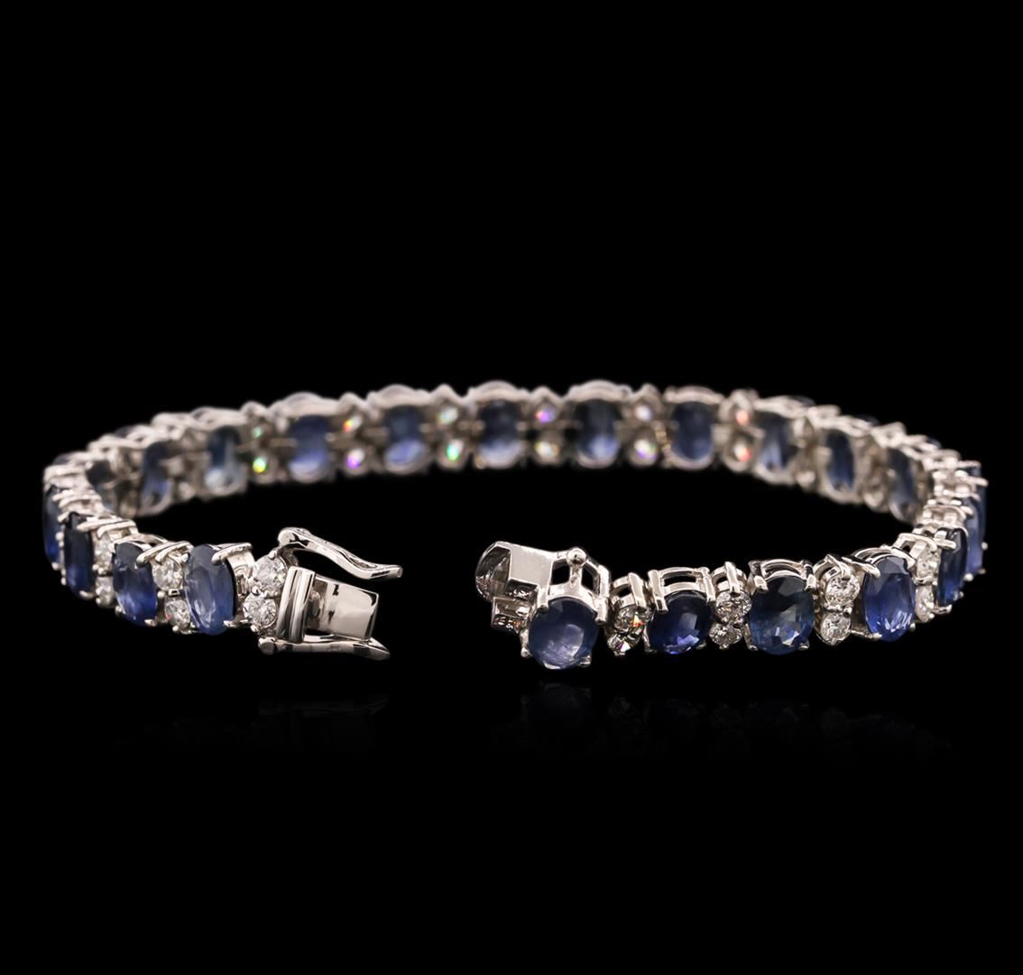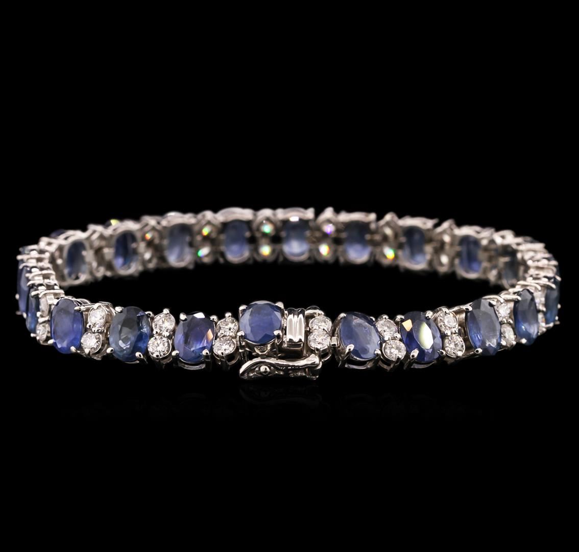 One electronically tested 14KT white gold ladies cast sapphire and diamond bracelet with a hidden box clasp with safety closer with a bright polish finish. 7.00." in length Condition is new. Containing: Twenty-two prong set oval modified brilliant cut natural blue sapphires, measuring 6.80 x 5.20 x 3.38mm, approximate total weight of 22.00ct., clarity is moderately included, type II, medium light, very slightly grayish, blue color, (GIA B 4/3), cut is good. Forty-Four prong set round brilliant cut diamonds, measuring 2.50 - 2.50 x 1.50mm (depth est.) approximate total weight of 44 Stones = 2.51ct. Clarity: SI-1 to SI-2. Color: H - I, Cut is Good. Colored gemstones are presumed to have been subjected to commonly used enhancement processes. All diamonds and colored gemstones are graded in the mounting, unless otherwise stated. Total Weight of Colored Stones 22.00ct. Total Weight of Diamonds 2.51ct. Total Weight of Bracelet 20.40 grams. GGL Appraised at $10,625.00.