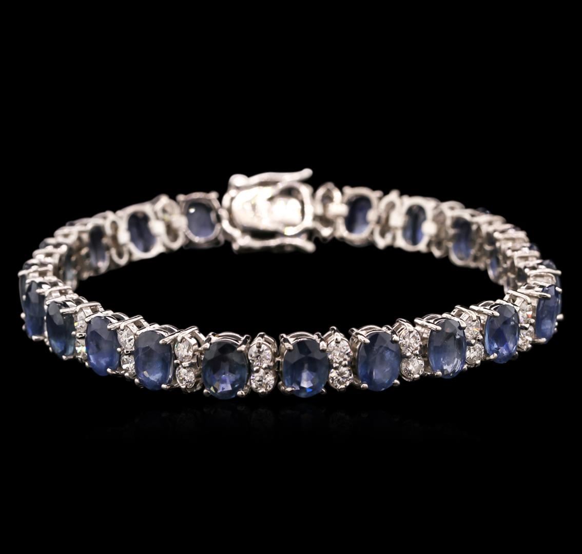 One electronically tested 14KT white gold ladies cast sapphire and diamond bracelet with a hidden box clasp with safety closer with a bright polish finish. 7.00." in length Condition is new. Containing: Twenty-two prong set oval modified brilliant cut natural blue sapphires, measuring 6.80 x 5.20 x 3.38mm, approximate total weight of 22.00ct., clarity is moderately included, type II, medium light, very slightly grayish, blue color, (GIA B 4/3), cut is good. Forty-Four prong set round brilliant cut diamonds, measuring 2.50 - 2.50 x 1.50mm (depth est.) approximate total weight of 44 Stones = 2.51ct. Clarity: SI-1 to SI-2. Color: H - I, Cut is Good. Colored gemstones are presumed to have been subjected to commonly used enhancement processes. All diamonds and colored gemstones are graded in the mounting, unless otherwise stated. Total Weight of Colored Stones 22.00ct. Total Weight of Diamonds 2.51ct. Total Weight of Bracelet 20.40 grams. GGL Appraised at $10,625.00.