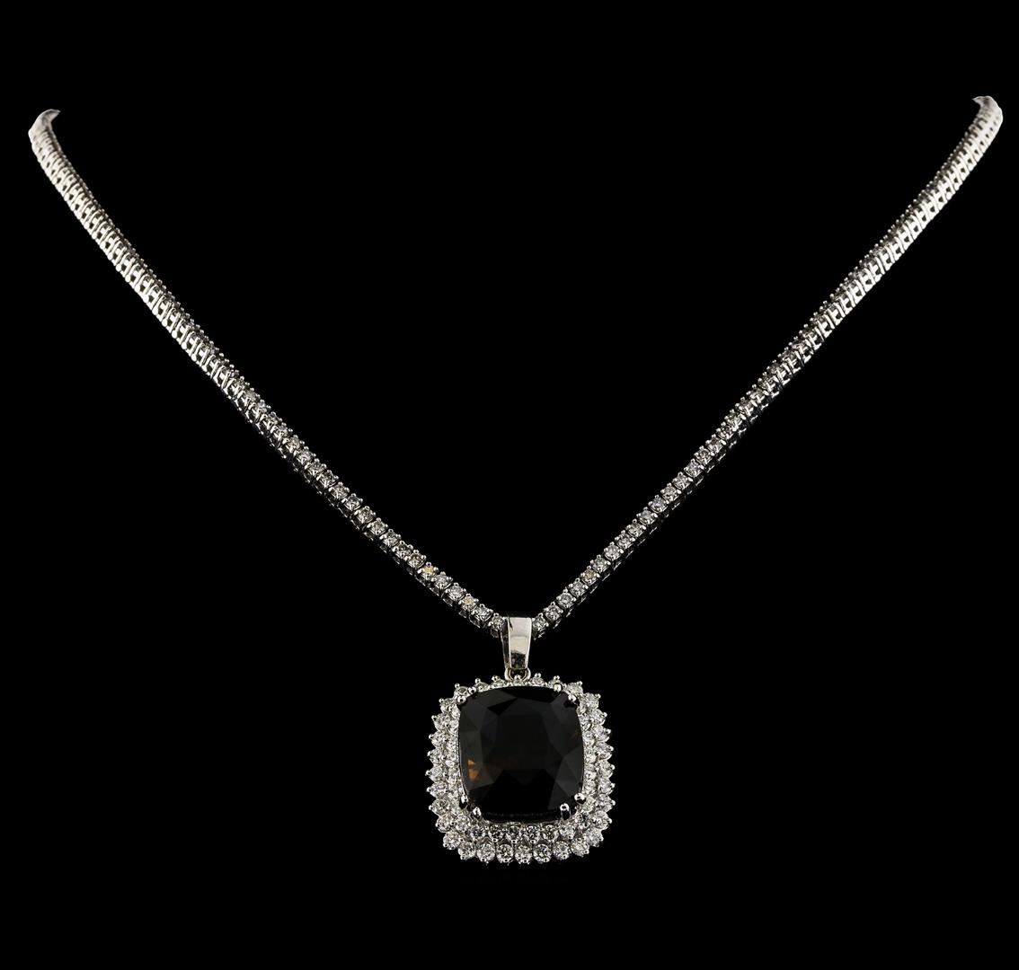 One 14KT White Gold Pendant with Diamond Necklace Included, 16 Inches, 33.06 grams. Containing: Main Gemstones: Identity: Natural Bi-Color Tourmaline. Carat Weight: 22.17 cts tw. Shape & Measurement: Cushion Shape 17.4 x 15.45. Quality: Very rare gem color. Cognac/Champagne Color. Fine Cutting. Adjacent Gemstones: Identity: Natural Diamond. Shape: Round Cut. Carat Weight: 6.16 cts tw. Quality: VS-SI Clarity, G-H Color. All fine cutting and proportions. Total gemstones weight: 28.33 cts tw. RBGS Appraised at $36,000.00.