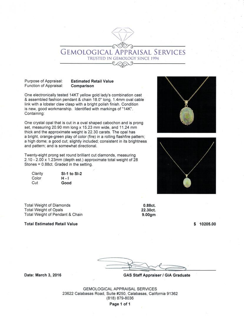 One electronically tested 14KT yellow gold lady's combination cast & assembled fashion pendant & chain 18.0" long, 1.4mm oval cable link with a lobster claw clasp with a bright polish finish. Identified with markings of "14K". Condition is new, good workmanship. Containing: One crystal opal that is cut in a oval shaped cabochon and is prong set, measuring 20.90 mm long x 15.23 mm wide, and 11.24 mm thick and the approximate weight is 22.30 carats. The opal has a bright, orange-green play of color (fire) in a rolling flashfire pattern; a high dome; a good cut; slightly included; consistent in its brightness and pattern; and is somewhat directional. Twenty-Eight prong set round brilliant cut diamonds, measuring 2.10 - 2.00 x 1.23mm (depth est.) approximate total weight of 28 Stones = 0.88ct. Graded in the setting. Clarity: SI-1 to SI-2. Color: H - I. Cut Good. Total Weight of Diamonds 0.88ct. Total Weight of Opals 22.30ct. Total Weight of Pendant & Chain 9.00gm. GAS Appraised at $10,205.00.
