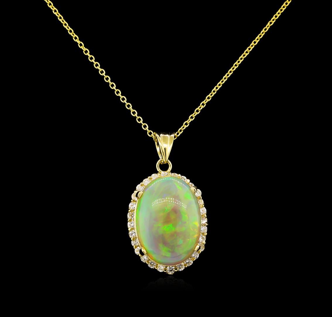 One electronically tested 14KT yellow gold lady's combination cast & assembled fashion pendant & chain 18.0" long, 1.4mm oval cable link with a lobster claw clasp with a bright polish finish. Identified with markings of "14K". Condition is new, good workmanship. Containing: One crystal opal that is cut in a oval shaped cabochon and is prong set, measuring 20.90 mm long x 15.23 mm wide, and 11.24 mm thick and the approximate weight is 22.30 carats. The opal has a bright, orange-green play of color (fire) in a rolling flashfire pattern; a high dome; a good cut; slightly included; consistent in its brightness and pattern; and is somewhat directional. Twenty-Eight prong set round brilliant cut diamonds, measuring 2.10 - 2.00 x 1.23mm (depth est.) approximate total weight of 28 Stones = 0.88ct. Graded in the setting. Clarity: SI-1 to SI-2. Color: H - I. Cut Good. Total Weight of Diamonds 0.88ct. Total Weight of Opals 22.30ct. Total Weight of Pendant & Chain 9.00gm. GAS Appraised at $10,205.00.