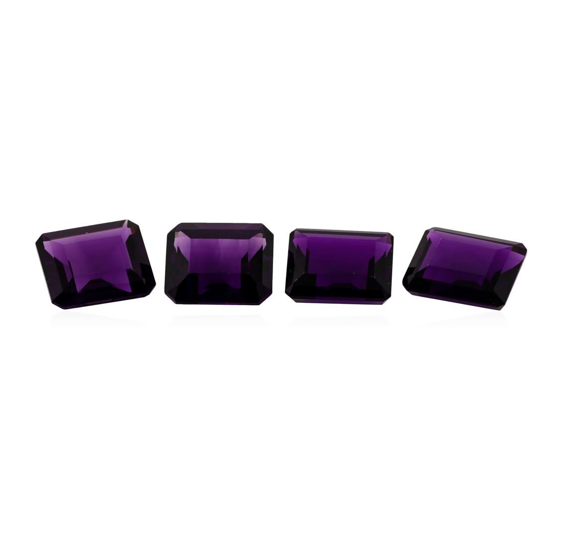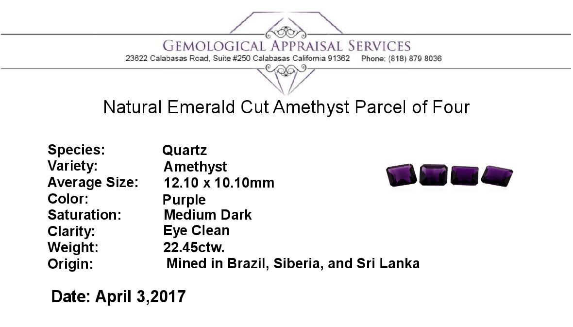 One natural emerald cut amethyst parcel of four with an exact weight of 22.45ctw., clarity is eye clean, purple, medium dark. Gemological Appraisals Services estimates the retail value at $763.3 GAS Appraised.
