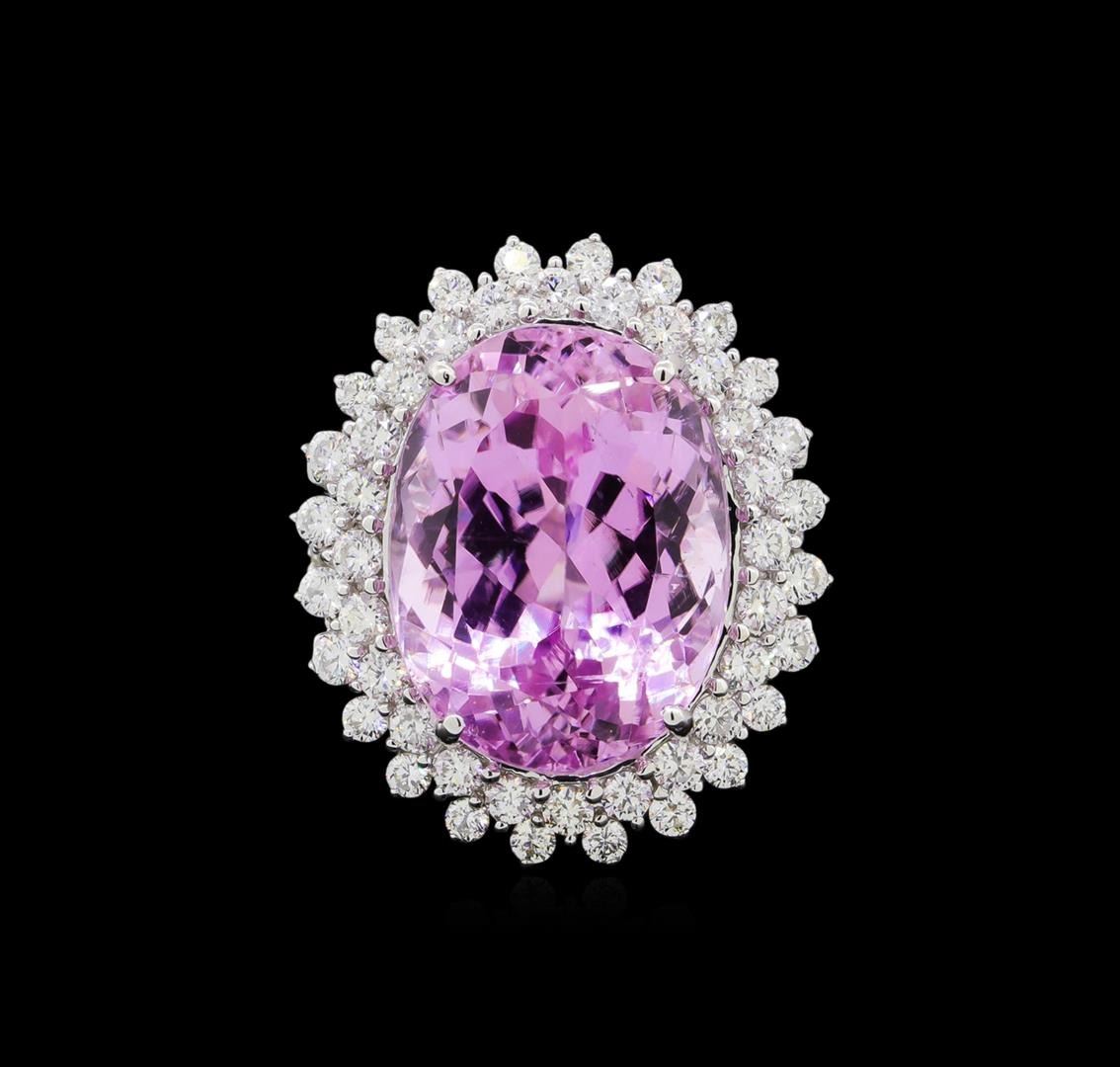 One electronically tested 14KT white gold lady's cast fashion ring with a split shank basket halo with a bright polish finish. The featured lady's ring has a shank measuring 2.44 millimeters in width. Identified with markings of "14K". Condition is new, good workmanship. Containing: One prong set oval modified brilliant cut natural kunzite, measuring 18.62 x 14.15 x 11.62mm, (depth est.) approximate weight of 22.47ct., clarity is eye clean, medium light, moderately strong, purple red color, (GIA PR 4/4), cut is very good. Transmitting light with no distortion, transparent. Colored gemstones are presumed to have been subjected to commonly used enhancement processes. Graded in the setting. Sixty-Eight prong set round brilliant cut diamonds, measuring 2.15 - 2.00 x 1.29mm (depth est.) approximate total weight of 68 Stones = 2.26ct. Graded in the setting. Clarity: VS-2 to SI-1. Color: G - I. Cut Good. Total Weight of Colored Stones 22.47ct. Total Weight of Diamonds 2.26ct. Total Weight of Ring 12.60gm. GAS Appraised at $15,980.00.