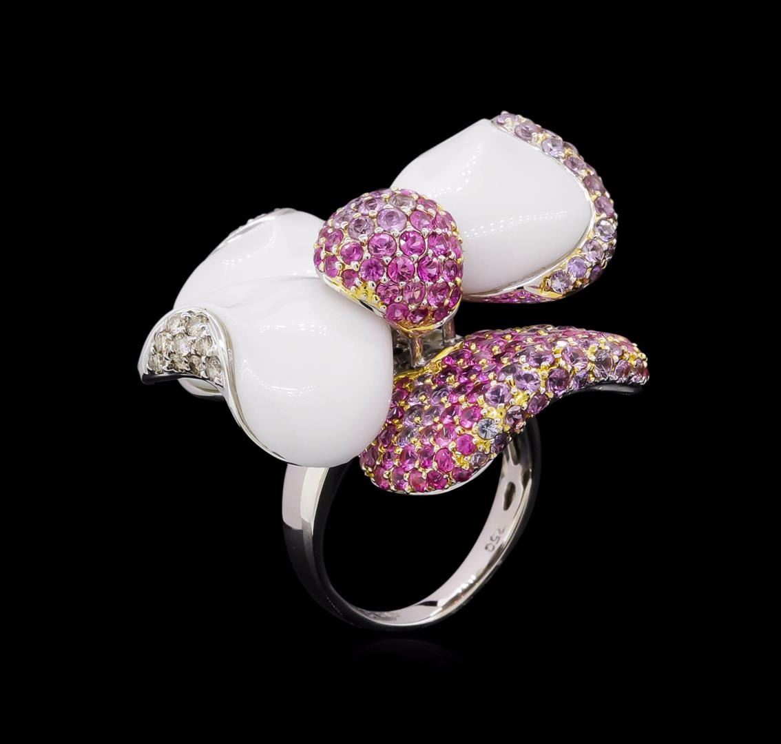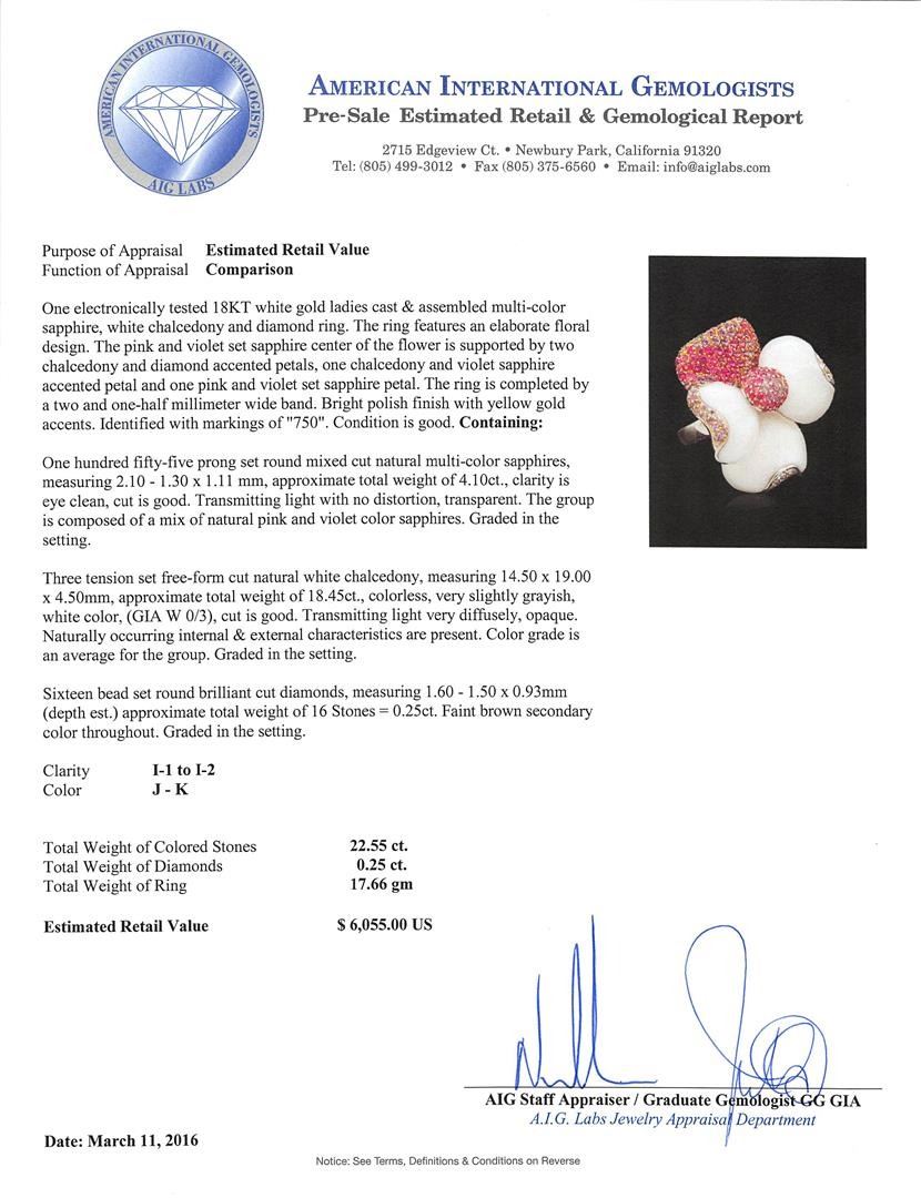 One electronically tested 18KT white gold ladies cast & assembled multi-color sapphire, white chalcedony and diamond ring. The ring features an elaborate floral design. The pink and violet set sapphire center of the flower is supported by two chalcedony and diamond accented petals, one chalcedony and violet sapphire accented petal and one pink and violet set sapphire petal. The ring is completed by a two and one-half millimeter wide band. Bright polish finish with yellow gold accents. Identified with markings of "750". Condition is good. Containing: One hundred fifty-five prong set round mixed cut natural multi-color sapphires, measuring 2.10 - 1.30 x 1.11mm, approximate total weight of 4.10ct., clarity is eye clean, cut is good. Transmitting light with no distortion, transparent. The group is composed of a mix of natural pink and violet color sapphires. Graded in the setting. Three tension set free-form cut natural white chalcedony, measuring 14.50 x 19.00 x 4.50mm, approximate total weight of 18.45ct., colorless, very slightly grayish, white color, (GIA W 0/3), cut is good. Transmitting light very diffusely, opaque. Naturally occurring internal & external characteristics are present. Color grade is an average for the group. Graded in the setting. Sixteen bead set round brilliant cut diamonds, measuring 1.60 - 1.50 x 0.93mm (depth est.) approximate total weight of 16 Stones = 0.25ct. Faint brown secondary color throughout. Graded in the setting. Clarity: I-1 to I-2. Color: J - K. Total Weight of Colored Stones 22.55ct. Total Weight of Diamonds 0.25ct. Total Weight of Ring 17.66 grams. AIG Appraised at $6,055.00.