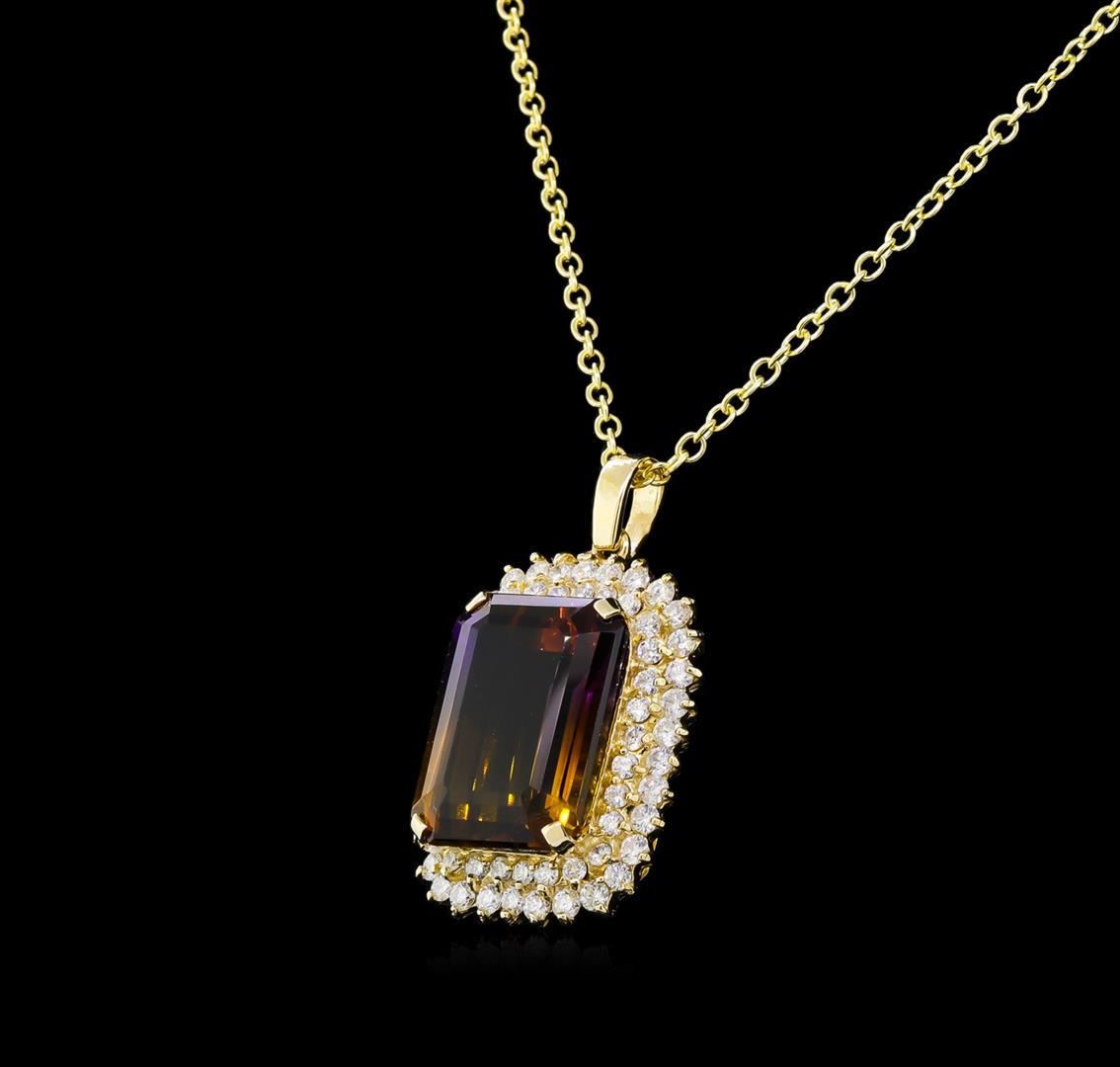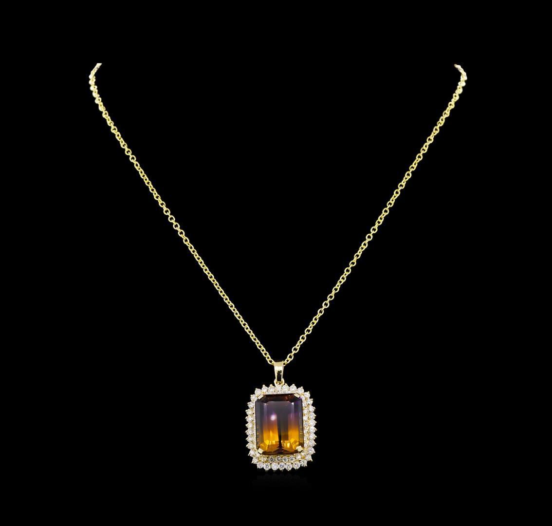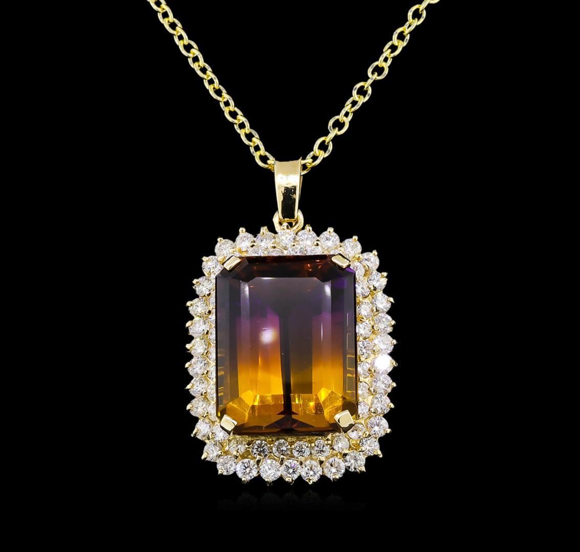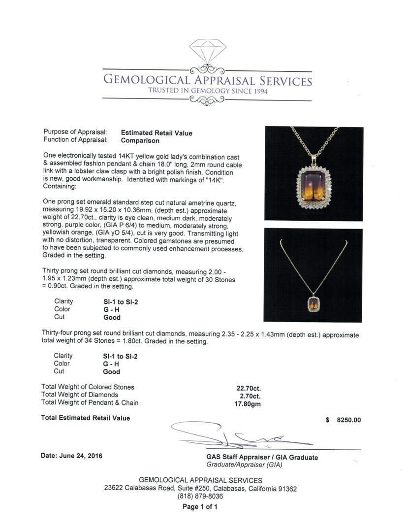 One electronically tested 14KT yellow gold lady's combination cast & assembled fashion pendant & chain 18.0" long, 2mm round cable link with a lobster claw clasp with a bright polish finish. Identified with markings of "14K". Condition is new, good workmanship. Containing: One prong set emerald standard step cut natural ametrine quartz, measuring 19.92 x 15.20 x 10.36mm, (depth est.) approximate weight of 22.70ct., clarity is eye clean, medium dark, moderately strong, purple color, (GIA P 6/4) to medium, moderately strong, yellowish orange, (GIA yO 5/4), cut is very good. Transmitting light with no distortion, transparent. Colored gemstones are presumed to have been subjected to commonly used enhancement processes. Graded in the setting. Thirty prong set round brilliant cut diamonds, measuring 2.00 - 1.95 x 1.23mm (depth est.) approximate total weight of 30 Stones = 0.90ct. Graded in the setting. Clarity: SI-1 to SI-2. Color: G - Good Thirty-Four prong set round brilliant cut diamonds, measuring 2.35 - 2.25 x 1.43mm (depth est.) approximate total weight of 34 Stones = 1.80ct. Graded in the setting. Clarity: SI-1 to SI-2. Color: G - Good. Total Weight of Colored Stones 22.70ct. Total Weight of Diamonds 2.70ct. Total Weight of Pendant & Chain 17.80gm. GAS Appraised.