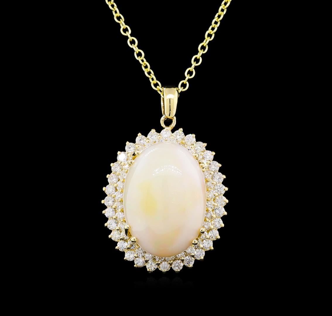One electronically tested 14KT yellow gold lady's combination cast & assembled fashion pendant & chain 20.0" long, 2mm oval cable link with a lobster claw clasp with a double basket halo with a bright polish finish. Identified with markings of "14K". Condition is new, good workmanship. Containing: Thirty-Two prong set round brilliant cut diamonds, measuring 2.40 - 2.30 x 1.46mm (depth est.) approximate total weight of 32 Stones = 1.57ct. Graded in the setting. Clarity: SI-1 to SI-2. Color: H - I. Cut Good Thirty-Two prong set round brilliant cut diamonds, measuring 2.10 - 2.00 x 1.27mm (depth est.) approximate total weight of 32 Stones = 1.04ct. Graded in the setting. Clarity: SI-1 to SI-2. Color: G - Good One crystal opal that is cut in a oval shaped cabochon and is prong set, measuring 24.80 mm long x 17.90 mm wide, and 12.60 mm thick and the approximate weight is 22.71 carats. The opal has a somewhat bright, orange-red play of color (fire) in a rolling flashfire pattern; a high dome; a fair cut; slightly included; slight variation in base in its brightness and pattern; and is not directional. Graded in the setting. Total Weight of Diamonds 2.61ct. Total Weight of Opals 22.71ct. Total Weight of Pendant & Chain 21.10gm. GAS Appraised.
