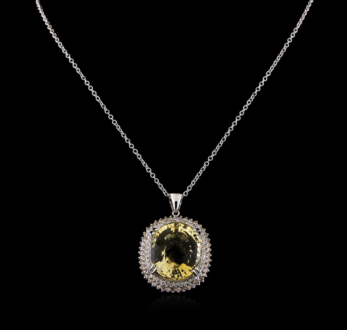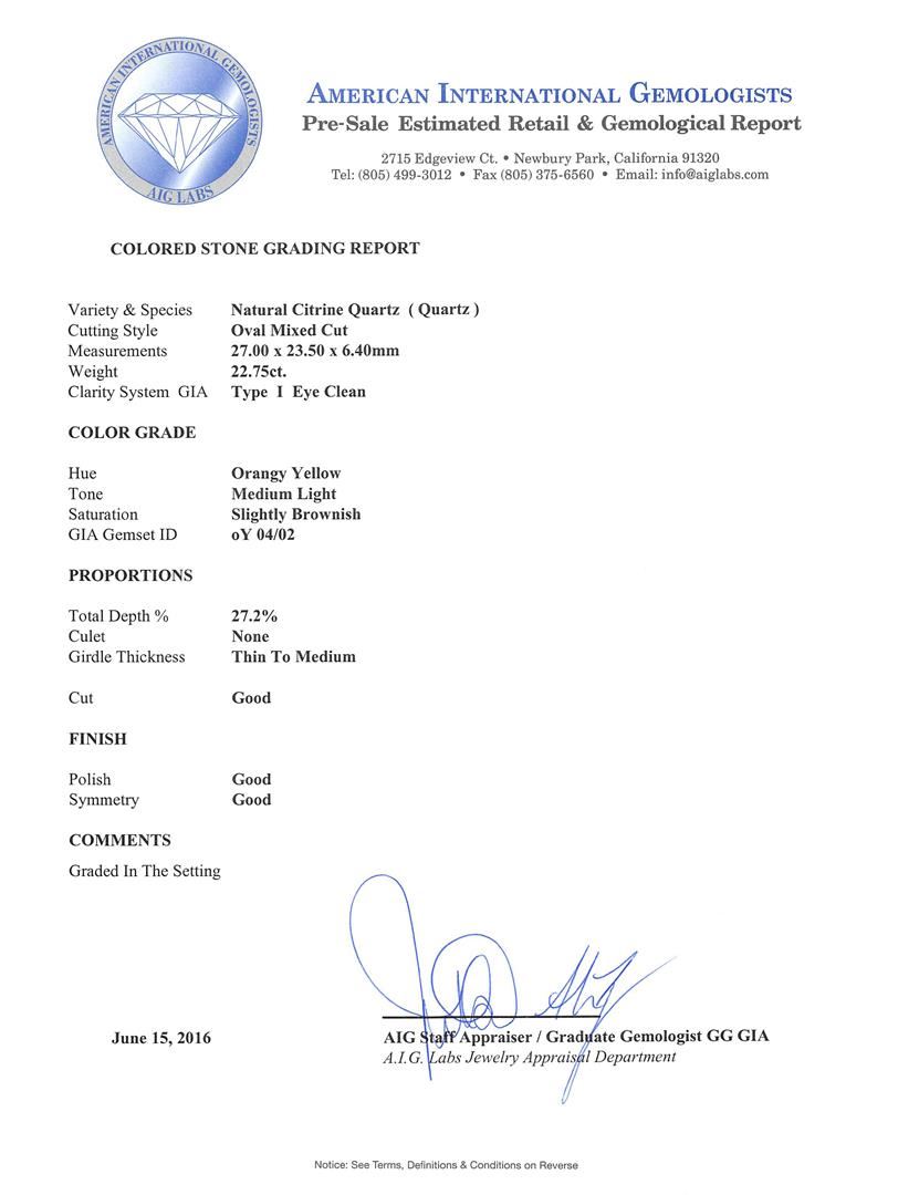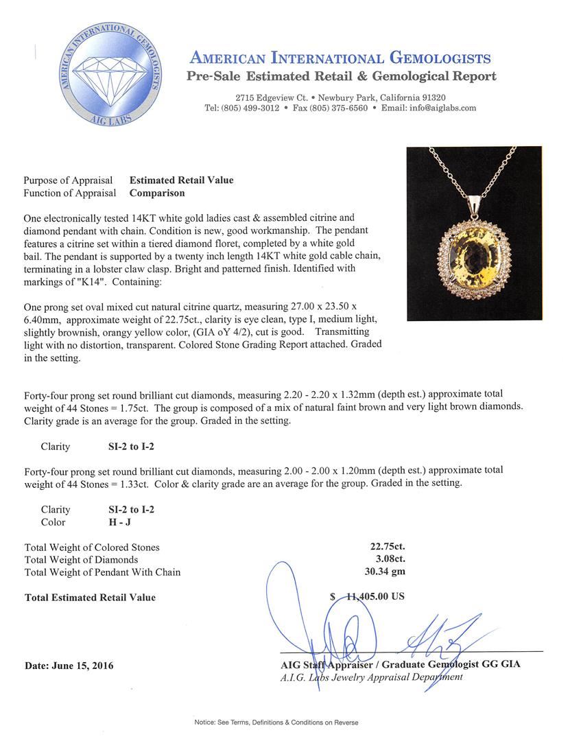 One electronically tested 14KT white gold ladies cast & assembled citrine and diamond pendant with chain. The pendant features a citrine set within a tiered diamond floret, completed by a white gold bail. The pendant is supported by a twenty inch length 14KT white gold cable chain, terminating in a lobster claw clasp. Bright and patterned finish. Identified with markings of "K14". Condition is new, good workmanship. Containing: One prong set oval mixed cut natural citrine quartz, measuring 27.00 x 23.50 x 6.40mm, approximate weight of 22.75ct., clarity is eye clean, type I, medium light, slightly brownish, orangy yellow color, (GIA oY 4/2), cut is good. Transmitting light with no distortion, transparent. Colored Stone Grading Report attached. Graded in the setting. Forty-Four prong set round brilliant cut diamonds, measuring 2.20 - 2.20 x 1.32mm (depth est.) approximate total weight of 44 Stones = 1.75ct. The group is composed of a mix of natural faint brown and very light brown diamonds. Clarity grade is an average for the group. Graded in the setting. Clarity: SI-2 to I-2 Forty-Four prong set round brilliant cut diamonds, measuring 2.00 - 2.00 x 1.20mm (depth est.) approximate total weight of 44 Stones = 1.33ct. Color & clarity grade are an average for the group. Graded in the setting. Clarity: SI-2 to I-2. Color: H - J. Total Weight of Colored Stones 22.75ct. Total Weight of Diamonds 3.08ct. Total Weight of Pendant With Chain 30.34gm. AIG Appraised at $11,405.00.