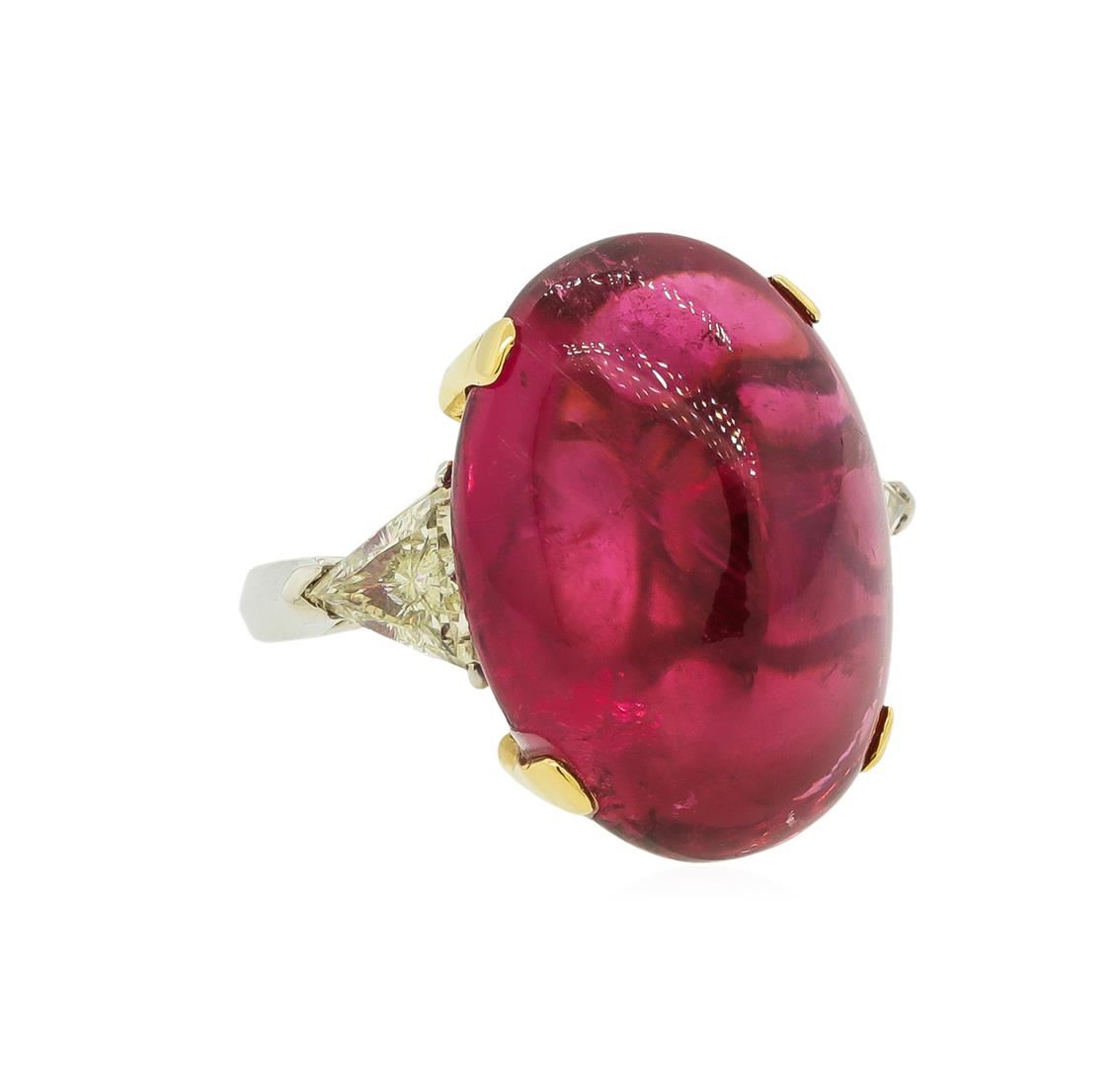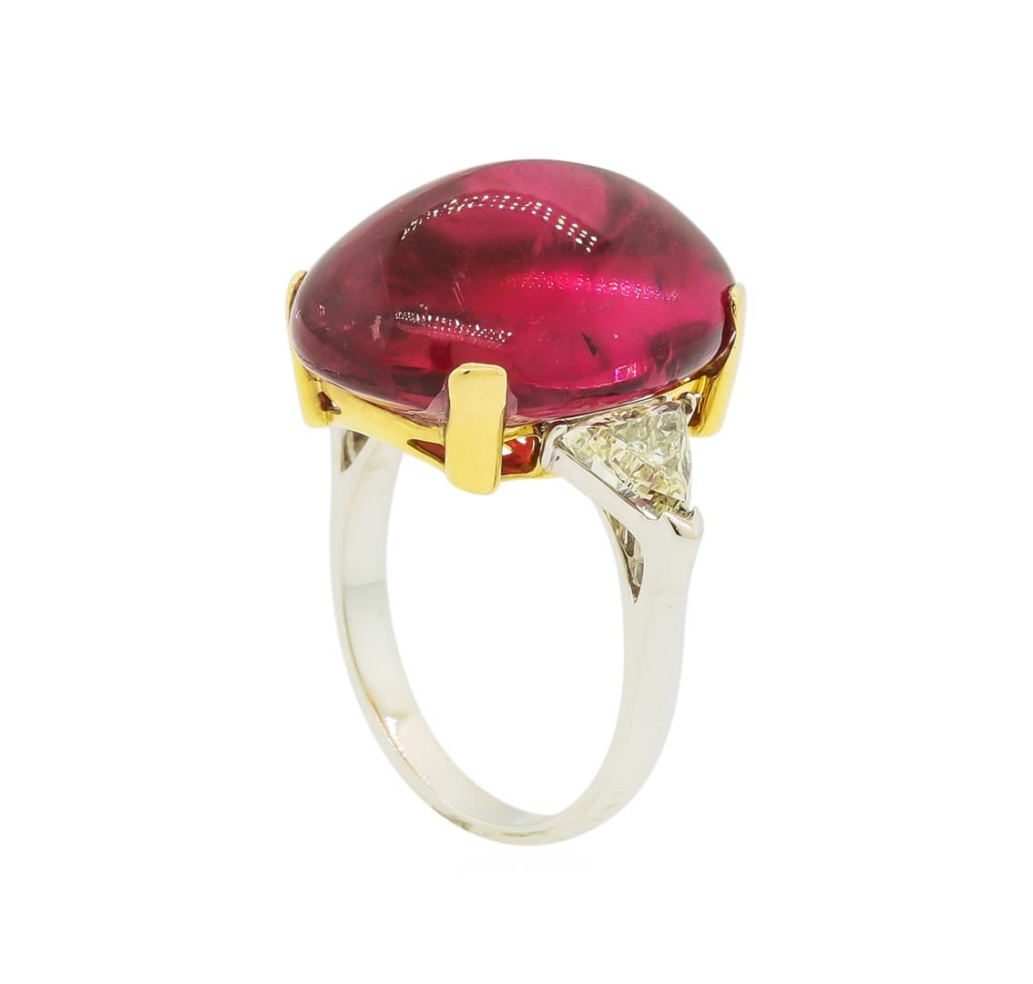 One electronically tested 18KT yellow and white gold lady's combination cast & assembled fashion three stone ring with a bright polish finish. The featured lady's ring has a shank measuring 2.53 millimeters wide. Identified with markings of '18K'. Condition is new, good workmanship. Containing: One prong set oval cabochon cut natural rubellite, measuring 20.68 x 14.97 x 10.01mm, (depth est.) approximate weight of 22.76ct., clarity is slightly included, medium, moderately strong, purple red color, (GIA PR 5/4), cut is good. Transmitting light with a minimum of distortion, transparent. Colored gemstones are presumed to have been subjected to commonly used enhancement processes. Graded in the setting. Two prong set triangle brilliant cut diamonds, measuring 6.30 x 6.10 x 2.41mm (depth est.) approximate total weight of 2 Stones = 1.08ct. Graded in the setting. Clarity VS-2 to SI-1. Color: H - I Cut Very Good. Total Weight of Colored Stones 22.76ct.. Total Weight of Diamonds 1.08ct.. Total Weight of Three Stone Ring 9.00gm. GAS Appraised at $15,710.00.