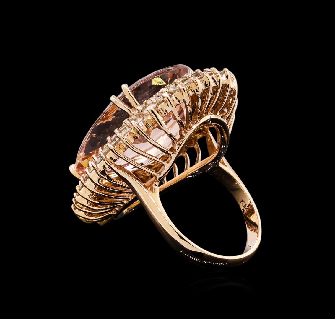 One electronically tested 14KT rose gold lady's cast fashion ring with a double basket halo with a bright polish finish. The featured lady's ring has a shank measuring 3.20 millimeters wide. Identified with markings of "K14". Condition is new, good workmanship. Containing: One prong set pear modified brilliant cut natural morganite, measuring 26.40 x 16.14 x 9.95mm, approximate weight of 22.88ct., clarity is eye clean, type I, light, very slightly brownish, orangy red color, (GIA oR 3/3), cut is very good. Transmitting light with no distortion, transparent. Colored gemstones are presumed to have been subjected to commonly used enhancement processes. Graded in the setting. Thirty-Four prong set round brilliant cut diamonds, measuring 2.40 - 2.30 x 1.43mm (depth est.) approximate total weight of 34 Stones = 1.65ct. Graded in the setting. Clarity: VS-2 to SI-2. Color: H - I. Cut Good Thirty-Three prong set round brilliant cut diamonds, measuring 2.10 - 2.00 x 1.29mm (depth est.) approximate total weight of 33 Stones = 1.10ct. Graded in the setting. Clarity: VS-2 to SI-2. Color: H - I. Cut Good. Total Weight of Colored Stones 22.88ct. Total Weight of Diamonds 2.75ct. Total Weight of Ring 15.20gm. GAS Appraised at $20,225.00.