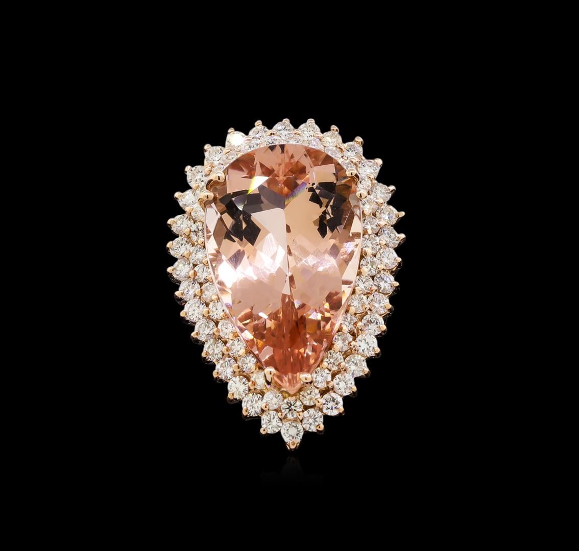 One electronically tested 14KT rose gold lady's cast fashion ring with a double basket halo with a bright polish finish. The featured lady's ring has a shank measuring 3.20 millimeters wide. Identified with markings of "K14". Condition is new, good workmanship. Containing: One prong set pear modified brilliant cut natural morganite, measuring 26.40 x 16.14 x 9.95mm, approximate weight of 22.88ct., clarity is eye clean, type I, light, very slightly brownish, orangy red color, (GIA oR 3/3), cut is very good. Transmitting light with no distortion, transparent. Colored gemstones are presumed to have been subjected to commonly used enhancement processes. Graded in the setting. Thirty-Four prong set round brilliant cut diamonds, measuring 2.40 - 2.30 x 1.43mm (depth est.) approximate total weight of 34 Stones = 1.65ct. Graded in the setting. Clarity: VS-2 to SI-2. Color: H - I. Cut Good Thirty-Three prong set round brilliant cut diamonds, measuring 2.10 - 2.00 x 1.29mm (depth est.) approximate total weight of 33 Stones = 1.10ct. Graded in the setting. Clarity: VS-2 to SI-2. Color: H - I. Cut Good. Total Weight of Colored Stones 22.88ct. Total Weight of Diamonds 2.75ct. Total Weight of Ring 15.20gm. GAS Appraised at $20,225.00.