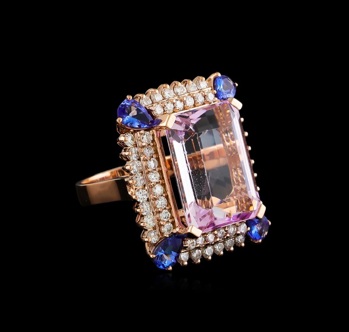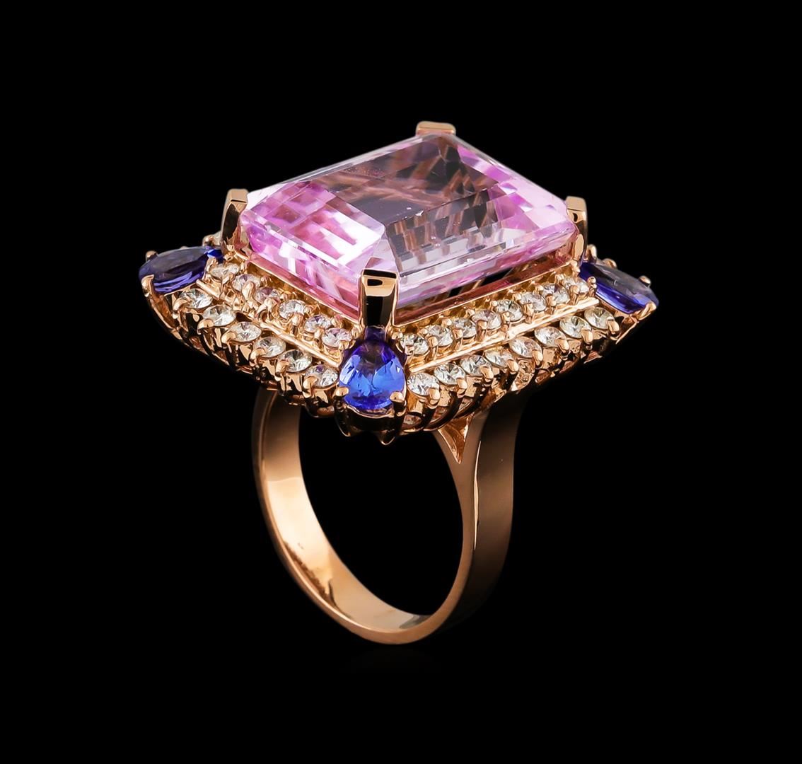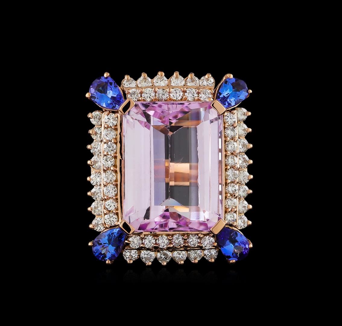 One electronically tested 14KT rose gold ladies cast kunzite, tanzanite and diamond ring with a bright polish finish. The featured kunzite is set within tiered diamond bezels with tanzanite corners supported by a ribbed under gallery, completed by a three millimeter wide band. Identified with markings of 14K. Condition is new, good workmanship. Containing: One prong set rectangular step cut natural kunzite, measuring 18.10 x 13.80 x 8.75mm, 10%. bulge factor, approximate weight of 22.94ct., clarity is slightly included, light, very slightly grayish, pink color, (GIA Pk 3/3), cut is good. Transmitting light with a minimum of distortion, transparent. Naturally occurring internal & external characteristics are present. Colored Stone Grading Report attached. Graded in the setting. Four prong set pear mixed cut natural tanzanites, measuring 6.00 x 4.00 x 2.60mm, approximate. Total Weight of 1.68ct., clarity is eye clean, type I, medium dark, very slightly grayish, violetish blue color, (GIA vB 6/3), cut is good. Transmitting light with no distortion, transparent. Measurements & the color grade are an average for the group. Graded in the setting. Tanzanite is a very rare gemstone that is only found in the country of Tanzania. Originally discovered in 1967. Tiffany & Company, named the stone Tanzanite. It is found in the Usumburu Mountains that border the Umba Valley of northern Tanzania. Tanzanite occurs in gray, brown, violet, blue, reddish-purple, & green. The gem is interesting because of its exceptional pleochroism. Rotated in different directions a tanzanite will exhibit multiple changes of color. Tanzanite has a low tolerance to ultrasonic cleaning, and should not be cleaned using this method. Twenty-Eight prong set round brilliant cut diamonds, measuring 2.00 - 2.00 x 1.20mm (depth est.) approximate. Total Weight of 28 Stones = 0.82ct. Graded in the setting. Clarity: I-1 to I-2. Color: G - I Twenty-Eight prong set round brilliant cut diamonds, measuring 1.90 - 1.90 x 1.14mm (depth est.) approximate. Total Weight of 28 Stones = 0.71ct. Graded in the setting. Clarity: SI-2 to I-2. Color: G - I. Total Weight of Colored Stones 24.62ct. Total Weight of Diamonds 1.53ct. Total Weight of Ring 16.42gm. AIG Appraised at $13,615.00.