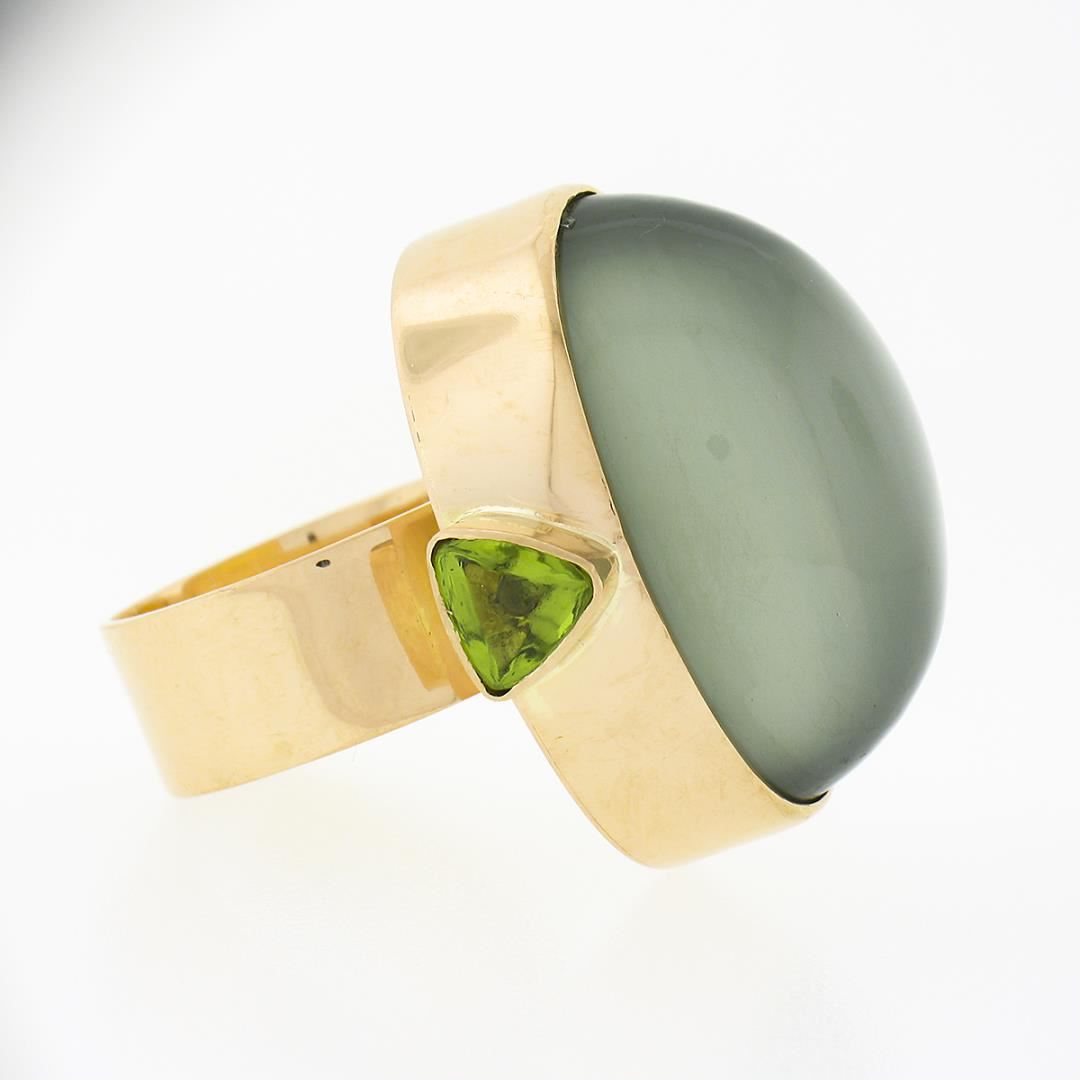 A solid 22k yellow gold cocktail ring, with 1 GIA graded oval cabochon cut natural cat's eye moonstone (25.10 x 14.62 mm), & 2 trillion cabochon cut natural peridots (6.1x6.1mm each ).. The ring is size 6.5, weighs a total of 19.78 grams, and measures 26.80mm wide. Comes with all original relevant certifications.