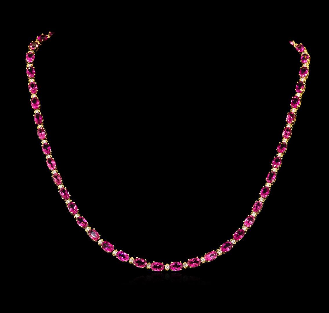 14K Yellow Gold 23CT Tourmaline 1.40CT Diamond Necklace. Description: Metal: 14k solid yellow gold. Face Measurements: 4 x 420mm. Size: 16.5. Finish: bright polish. Total Item Weight: 18.5 grams. Markings: stamped 14K. Country Made: USA. Main Stone: tourmaline. Quantity: 52. Shape: oval. Color: pink. Carat Total Weight: 23.00. Measurements: 4 x 6mm. Treatment: none. Setting: prong. Hue: pink. Saturation: moderately strong. Tone: dark. Clarity: type 2. Cut: very good. Secondary Stone: diamond. Quantity: 52. Shape: round. Color: white. Carat Total Weight: 1.40. Measurements: 1.9 - 2mm. Treatment: none. Setting: prong. Color Grade: H-I. Clarity: SI1-SI2. Cut: very good. Excellent Workmanship. Gemstones graded in the mounting. BHGL Appraised at $17,200.00.