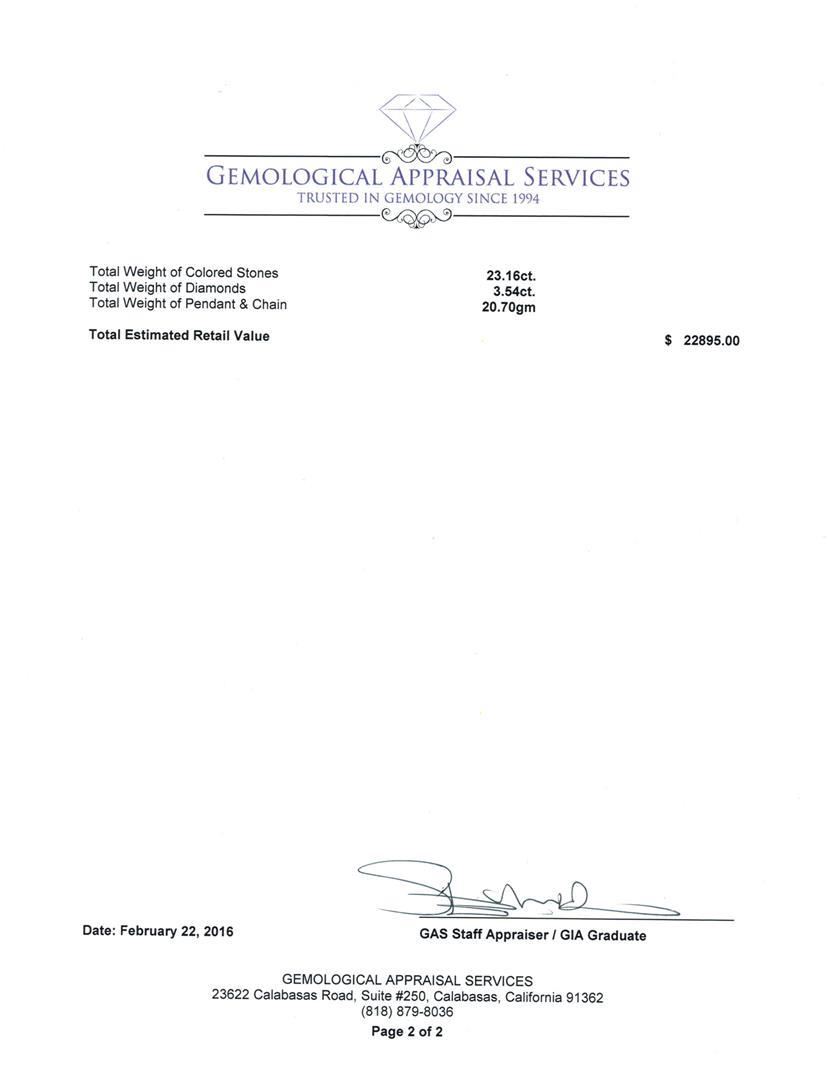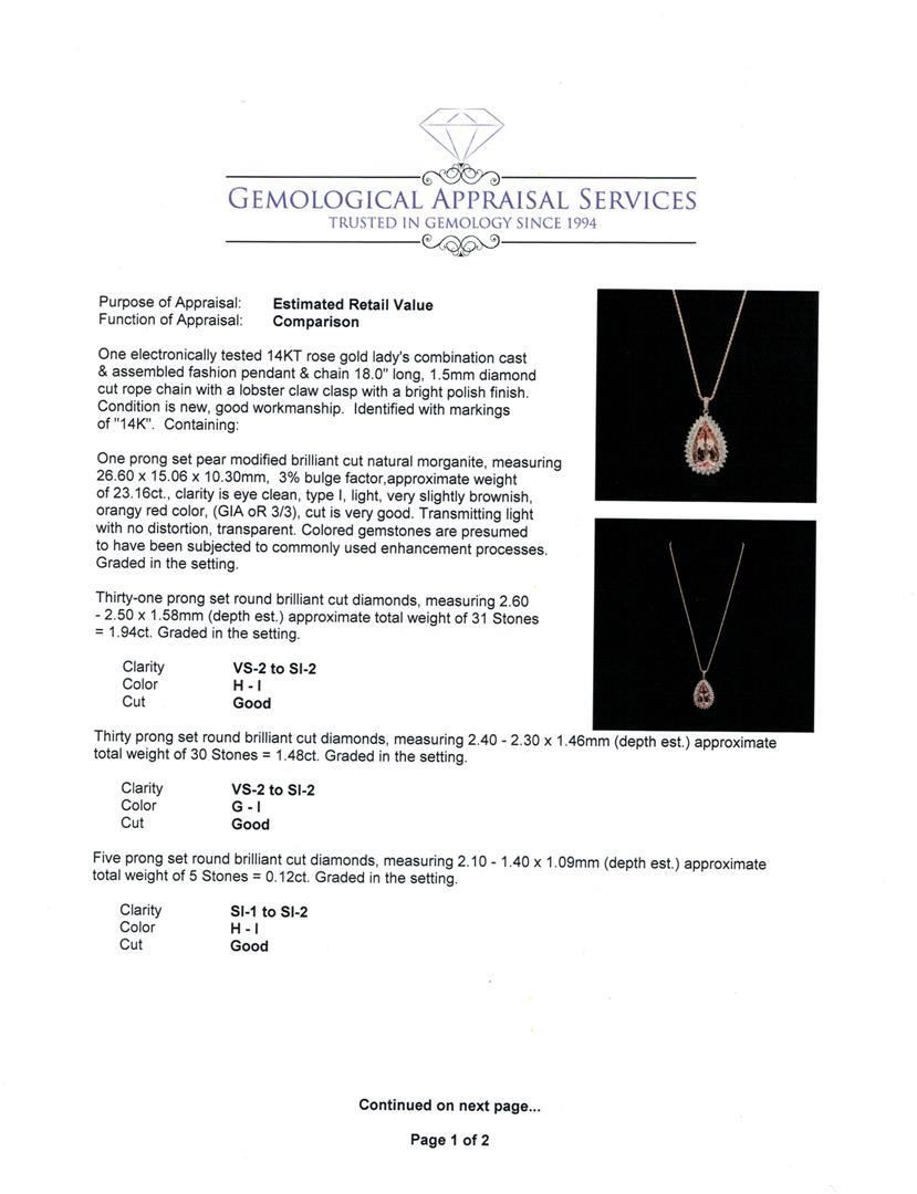 One electronically tested 14KT rose gold lady's combination cast & assembled fashion pendant & chain 18.0" long, 1.5mm diamond cut rope chain with a lobster claw clasp with a bright polish finish. Identified with markings of "14K". Condition is new, good workmanship. Containing: One prong set pear modified brilliant cut natural morganite, measuring 26.60 x 15.06 x 10.30mm, 3%. bulge factor, approximate weight of 23.16ct., clarity is eye clean, type I, light, very slightly brownish, orangy red color, (GIA oR 3/3), cut is very good. Transmitting light with no distortion, transparent. Colored gemstones are presumed to have been subjected to commonly used enhancement processes. Graded in the setting. Thirty-One prong set round brilliant cut diamonds, measuring 2.60 - 2.50 x 1.58mm (depth est.) approximate total weight of 31 Stones = 1.94ct. Graded in the setting. Clarity: VS-2 to SI-2. Color: H - I. Cut Good Thirty prong set round brilliant cut diamonds, measuring 2.40 - 2.30 x 1.46mm (depth est.) approximate total weight of 30 Stones = 1.48ct. Graded in the setting. Clarity: VS-2 to SI-2. Color: G - I. Cut Good Five prong set round brilliant cut diamonds, measuring 2.10 - 1.40 x 1.09mm (depth est.) approximate total weight of 5 Stones = 0.12ct. Graded in the setting. Clarity: SI-1 to SI-2. Color: H - I. Cut Good. Total Weight of Colored Stones 23.16ct. Total Weight of Diamonds 3.54ct. Total Weight of Pendant & Chain 20.70gm. GAS Appraised.