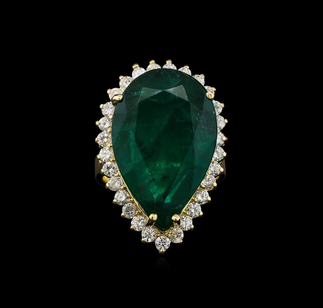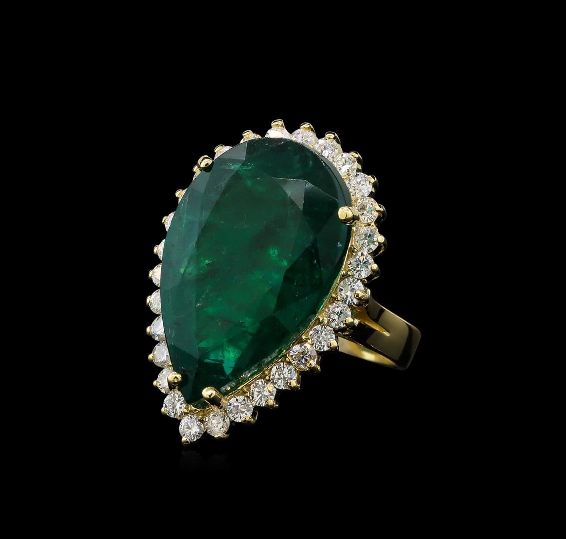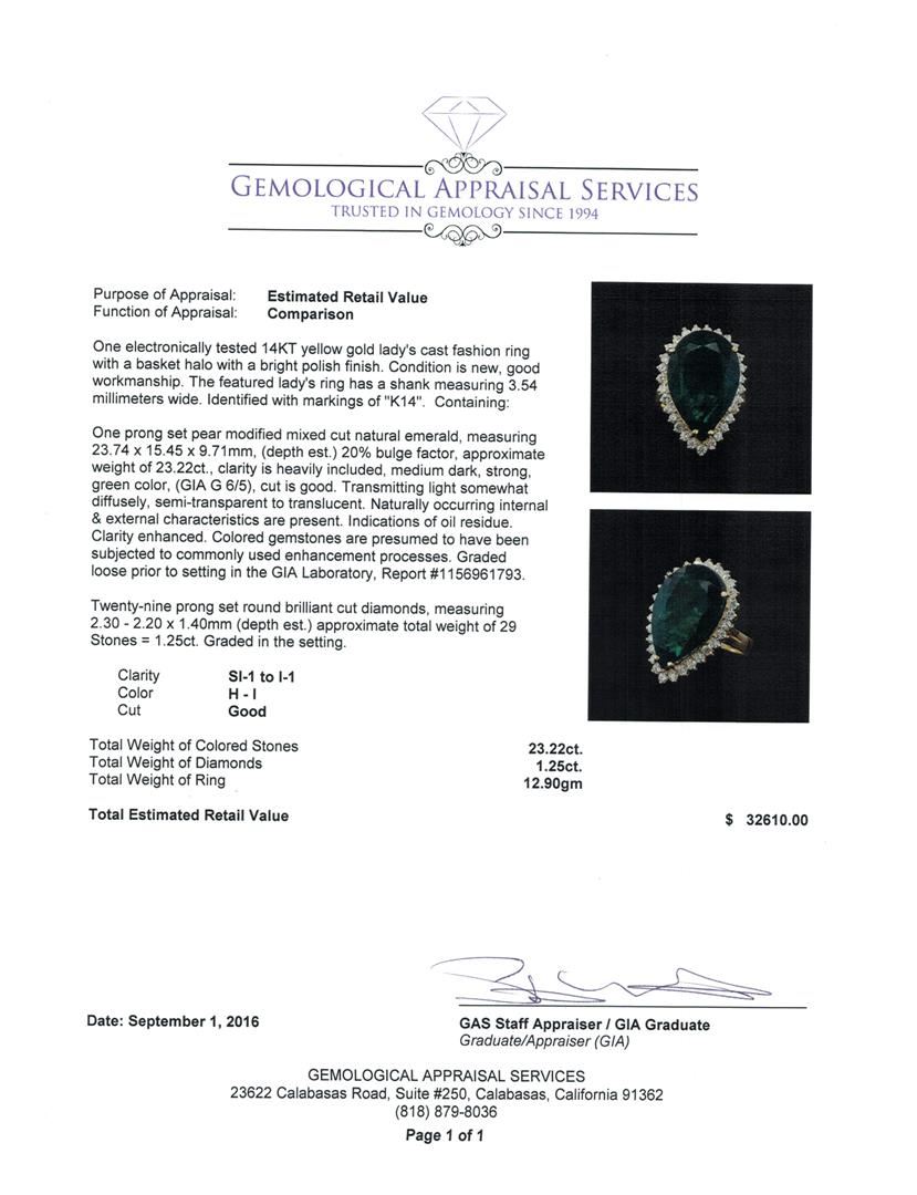 One electronically tested 14KT yellow gold lady's cast fashion ring with a basket halo with a bright polish finish. The featured lady's ring has a shank measuring 3.54 millimeters wide. Identified with markings of 'K14'. Condition is new, good workmanship. Containing: One prong set pear modified mixed cut natural emerald, measuring 23.74 x 15.45 x 9.71mm, (depth est.) 20%. bulge factor, approximate weight of 23.22ct., clarity is heavily included, medium dark, strong, green color, (GIA G 6/5), cut is good. Transmitting light somewhat diffusely, semi-transparent to translucent. Naturally occurring internal & external characteristics are present. Indications of oil residue. Clarity enhanced. Colored gemstones are presumed to have been subjected to commonly used enhancement processes. Graded loose prior to setting in the GIA Laboratory, Report #1156961793. Twenty-Nine prong set round brilliant cut diamonds, measuring 2.30 - 2.20 x 1.40mm (depth est.) approximate total weight of 29 Stones = 1.25ct. Graded in the setting. Clarity SI-1 to I-1. Color: H - I Cut Good. Total Weight of Colored Stones 23.22ct.. Total Weight of Diamonds 1.25ct.. Total Weight of Ring 12.90gm GAS Appraised at $32,610.00.