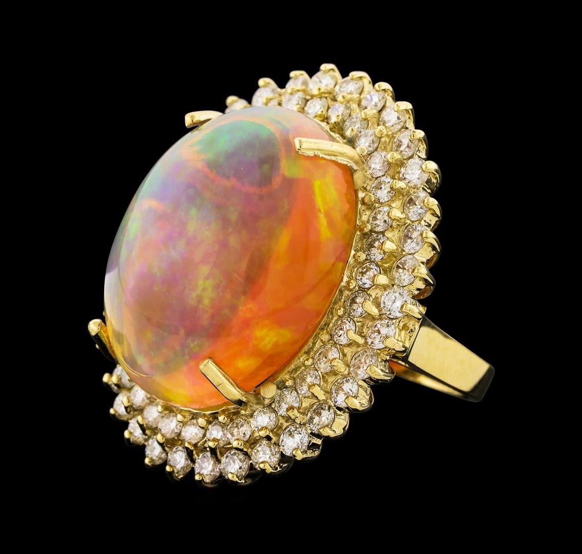 One electronically tested 14KT yellow gold lady's cast fashion ring with a double basket halo with a bright polish finish. The featured lady's ring has a shank measuring 2.66 millimeters wide. Identified with markings of 'K14'. Condition is new, good workmanship. Containing: One orange crystal that is cut in a oval shaped cabochon and is prong set, measuring 23.50 mm long x 19.80 mm wide, and 10.11 mm thick and the approximate weight is 23.36 carats. The opal has a quite bright, red-blue multicolor play of color (fire) in a rolling flashfire pattern; a medium dome; a good cut; no inclusions; slight variation in base in its brightness and pattern; and is slightly directional. Graded in the setting. Thirty-Four prong set round brilliant cut diamonds, measuring 2.40 - 2.35 x 1.45mm (depth est.) approximate total weight of 34 Stones = 1.70ct. Graded in the setting. Clarity SI-1 to SI-3. Color: H - I Cut Good Thirty-Four prong set round brilliant cut diamonds, measuring 2.10 - 2.00 x 1.27mm (depth est.) approximate total weight of 34 Stones = 1.12ct. Graded in the setting. Clarity SI-1 to I-1. Color: G - H Cut Good. Total Weight of Diamonds 2.82ct.. Total Weight of Opals 23.36ct.. Total Weight of Ring 18.70gm. GAS Appraised at $13,125.00.