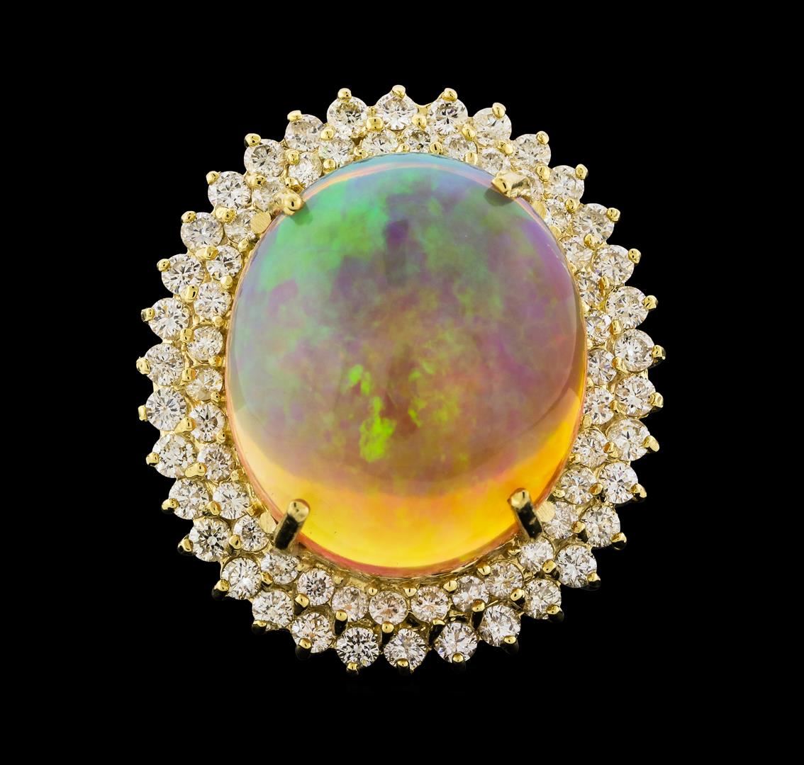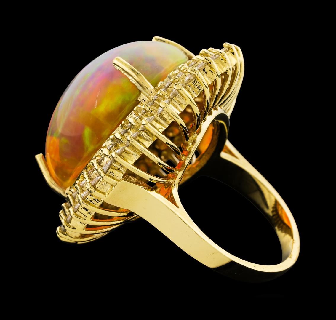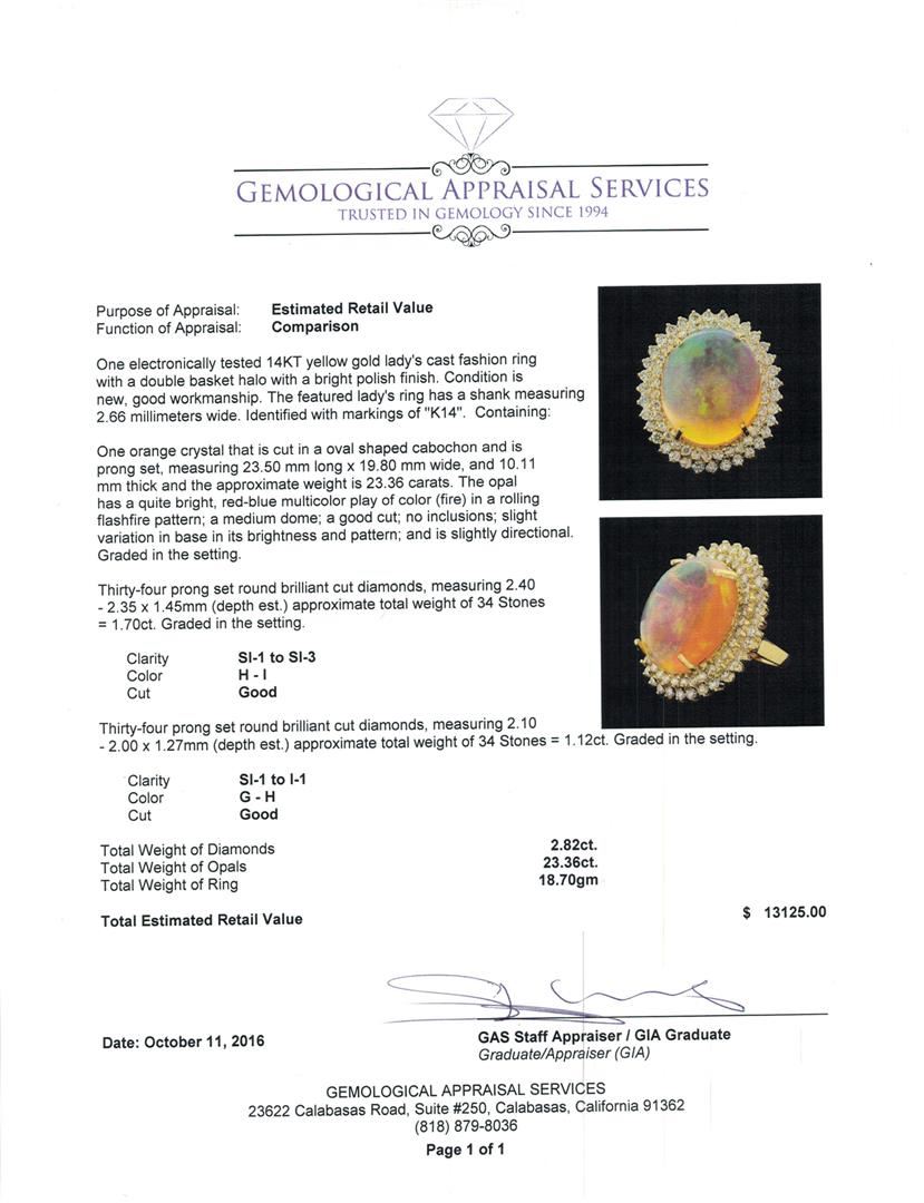 One electronically tested 14KT yellow gold lady's cast fashion ring with a double basket halo with a bright polish finish. The featured lady's ring has a shank measuring 2.66 millimeters wide. Identified with markings of 'K14'. Condition is new, good workmanship. Containing: One orange crystal that is cut in a oval shaped cabochon and is prong set, measuring 23.50 mm long x 19.80 mm wide, and 10.11 mm thick and the approximate weight is 23.36 carats. The opal has a quite bright, red-blue multicolor play of color (fire) in a rolling flashfire pattern; a medium dome; a good cut; no inclusions; slight variation in base in its brightness and pattern; and is slightly directional. Graded in the setting. Thirty-Four prong set round brilliant cut diamonds, measuring 2.40 - 2.35 x 1.45mm (depth est.) approximate total weight of 34 Stones = 1.70ct. Graded in the setting. Clarity SI-1 to SI-3. Color: H - I Cut Good Thirty-Four prong set round brilliant cut diamonds, measuring 2.10 - 2.00 x 1.27mm (depth est.) approximate total weight of 34 Stones = 1.12ct. Graded in the setting. Clarity SI-1 to I-1. Color: G - H Cut Good. Total Weight of Diamonds 2.82ct.. Total Weight of Opals 23.36ct.. Total Weight of Ring 18.70gm. GAS Appraised at $13,125.00.