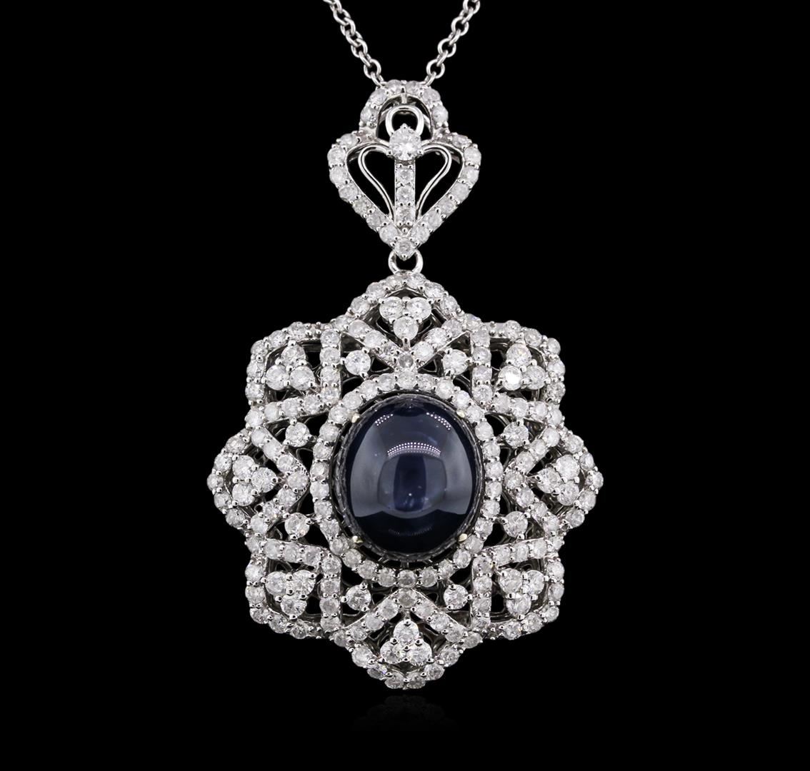 One electronically tested 14KT white gold ladies cast & assembled blue star sapphire and diamond pendant with chain. The pendant features a blue star sapphire set within an elaborate diamond lattice gallery, completed by a diamond set bail. The pendant is supported by an eighteen inch length 14KT white gold designer style chain, terminating in a lobster claw clasp. Bright polish finish. Trademark is Orianne. Identified with markings of "14K". Condition is new, good workmanship. Containing: One prong set oval cabochon cut natural blue star sapphire, measuring 15.00 x 13.00 x 9.50mm, approximate weight of 23.38ct., clarity is severely included, dark, very slightly grayish, violetish blue color, (GIA vB 7/3), cut is fair. This stone has a complete six ray star with strong intensity and good movement. Transmitting light very diffusely, opaque. Naturally occurring internal & external characteristics are present. Indications of laboratory high temperature diffusion treatment. Colored Stone Grading Report attached. Graded in the setting,. One Hundred Ninety-One prong set round brilliant cut diamonds, measuring 2.30 - 1.80 x 1.23mm (depth est.) approximate total weight of 191 Stones = 5.56ct. Graded in the setting. Clarity: I-1 to I-2. Color: G - I. Total Weight of Colored Stones 23.38ct. Total Weight of Diamonds 5.56ct. AIG Appraised at $22,285.00.