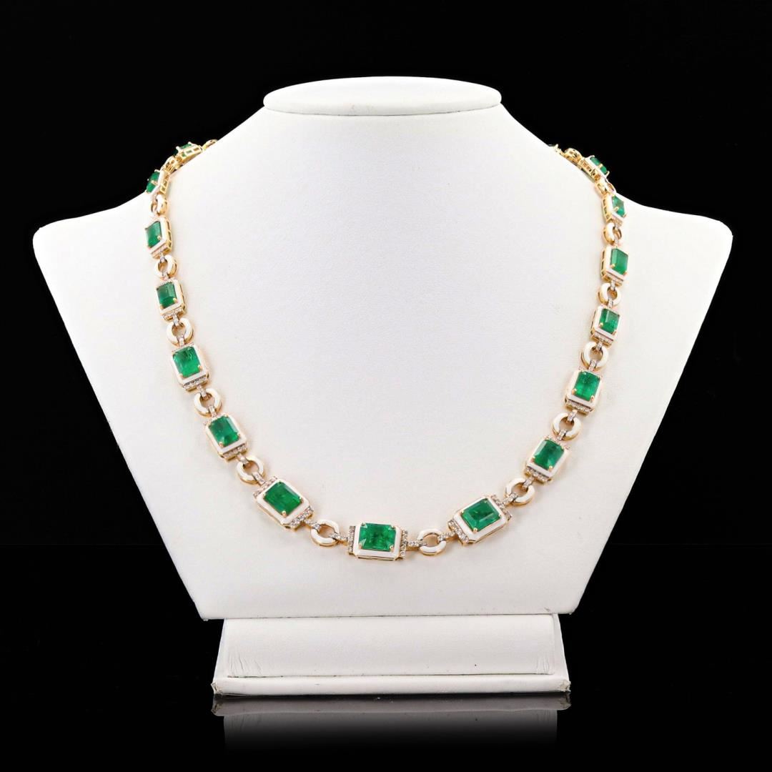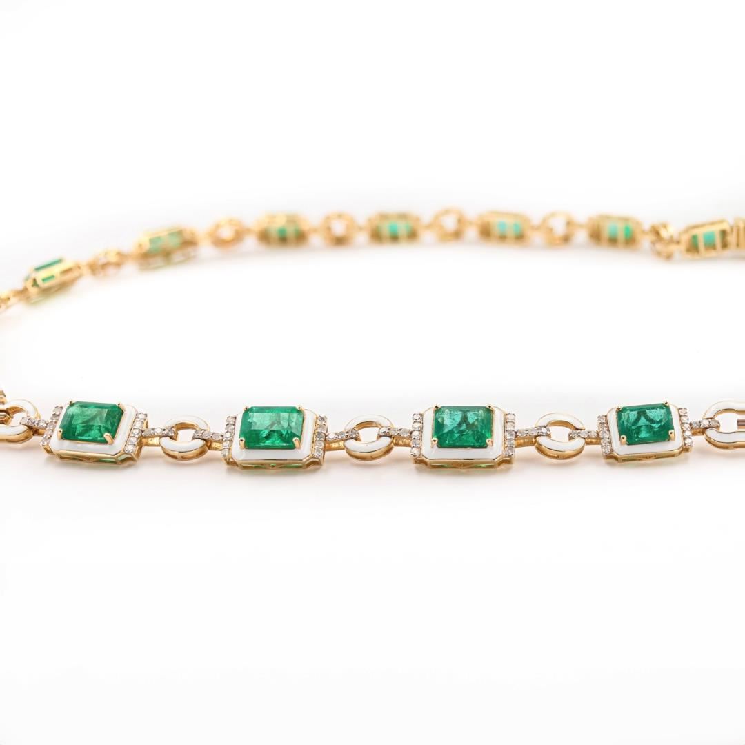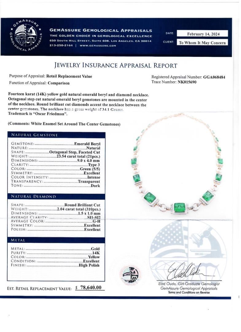 Fourteen karat (14K) yellow gold natural emerald beryl and diamond necklace. Octagonal step cut natural emerald beryl gemstones are mounted in the center of the necklace. Round brilliant cut diamonds accent the necklace between the center gemstones. The necklace has o grass weight of 34.1 Grams. Trademark is "Oscar Friedman". (Comments: White Enamel Set Around The Center Gemstones) #NATURAL GEMSTONE# GEMSTONE: Emerald Beryl NATURE: Natural SHAPE: Octagonal Step, Faceted Cut WEIGHT: 23.54 carat total (21pcs.) DIMENSIONS: 9.0 x 4.0mm CLARITY: Type 3 COLOR: Green (5/5) SYMMETRY: Excellent COLOR INTENSITY: Intense TRANSPARENCY: Transparent TONE: Dark #NATURAL DIAMOND# SHAPE: Round Brilliant Cut WEIGHT: 2.04 carat total (310pcs.) DIMENSIONS: 1.5 x 1.0mm AVERAGE CLARITY: SI1-SI2 AVERAGE COLOR: G-H SYMMETRY: Excellent POLISH: Excellent #METAL# METAL: Gold PURITY: 14K COLOR: Yellow CONDITION: Excellent FINISH: High Polish Size: 17