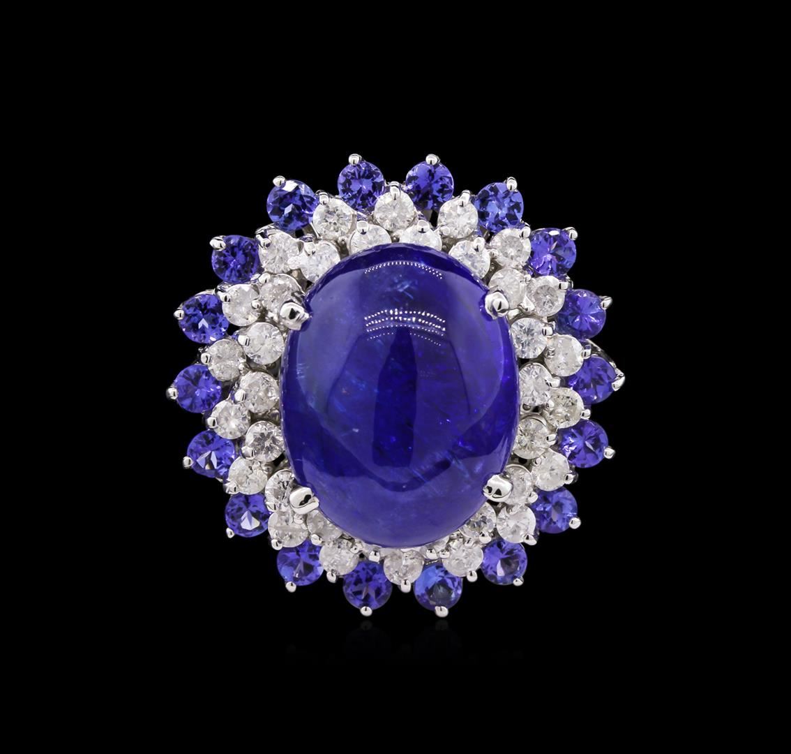 One electronically tested 14KT white gold ladies cast tanzanite and diamond ring with a bright polish finish. The featured tanzanite is set within a tiered diamond and tanzanite floret, completed by a two and one-half millimeter wide band. Identified with markings of "K14". Condition is new, good workmanship. Containing: One prong set oval cabochon cut natural tanzanite, measuring 18.80 x 14.80 x 8.85mm, approximate weight of 21.19ct., clarity is heavily included, type I, dark, moderately strong, bluish violet color, (GIA bV 7/4), cut is good. Transmitting light somewhat diffusely, transparent to translucent. Naturally occurring internal & external characteristics are present. Colored Stone Grading Report attached. Graded in the setting. Eighteen prong set round brilliant cut natural tanzanites, measuring 3.10 - 3.00 x 1.98 mm, approximate total weight of 2.44ct., clarity is eye clean, type I, medium dark, moderately strong, bluish violet color, (GIA bV 6/4), cut is good. Transmitting light with no distortion, transparent. Color grade is an average for the group. Graded in the setting. Tanzanite is a very rare gemstone that is only found in the country of Tanzania. Originally discovered in 1967. Tiffany & Company, named the stone Tanzanite. It is found in the Usumburu Mountains that border the Umba Valley of northern Tanzania. Tanzanite occurs in gray, brown, violet, blue, reddish-purple, & green. The gem is interesting because of its exceptional pleochroism. Rotated in different directions a tanzanite will exhibit multiple changes of color. Tanzanite has a low tolerance to ultrasonic cleaning, and should not be cleaned using this method. Thirty-Six prong set round brilliant cut diamonds approximate total weight of 36 Stones = 2.29ct. Graded in the setting. Clarity: I-1 to I-2. Color: G - I. Total Weight of Colored Stones 23.63ct. Total Weight of Diamonds 2.29ct. Total Weight of Ring 17.60gm. AIG Appraised at $14,360.00.