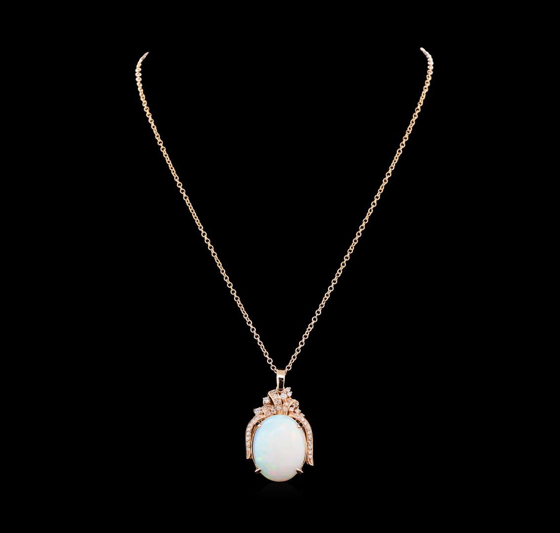 One electronically tested 14KT rose gold lady's combination cast & assembled fashion pendant & chain 20.0" long, 2.2mm round cable link with a lobster claw clasp with a bright polish finish. Identified with markings of "14K". Condition is new, good workmanship. Containing: Three prong set round brilliant cut diamonds, measuring 2.60 - 2.55 x 1.60mm (depth est.) approximate total weight of 3 Stones = 0.20ct. Graded in the setting. Clarity: SI-1 to SI-2. Color: H - I. Cut Good Six prong set round brilliant cut diamonds, measuring 2.00 - 1.90 x 1.17mm (depth est.) approximate total weight of 6 Stones = 0.16ct. Graded in the setting. Clarity: SI-1 to SI-2. Color: H - I. Cut Good One crystal opal that is cut in a oval shaped cabochon and is prong set, measuring 25.85 mm long x 20.28 mm wide, and 11.71 mm thick and the approximate weight is 23.65 carats. The opal has a somewhat bright, multicolor play of color (fire) in a rolling flashfire pattern; a medium dome; a good cut; no inclusions; slight variation in base in its brightness and pattern; and is not directional. Graded in the setting. Twenty-Eight prong set round brilliant cut diamonds, measuring 1.60 - 1.55 x 0.98mm (depth est.) approximate total weight of 28 Stones = 0.42ct. Graded in the setting. Clarity: SI-1 to SI-2. Color: H - I. Cut Good. Total Weight of Diamonds 0.78ct. Total Weight of Opals 23.65ct. Total Weight of Pendant & Chain 20.70gm. GAS Appraised at $9,760.00.