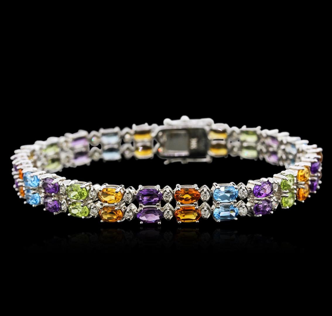 One electronically tested 14KT white gold ladies cast multi-gemstone and diamond bracelet with a hidden box clasp with safety closer with a bright polish finish. Measurements: 7" in length. Identified with markings of "14K". Condition is new. Containing: Twelve prong set oval modified brilliant cut natural amethysts, measuring 5.00 x 3.00 x 1.95mm, approximate total weight of 6.00ct., clarity is eye clean, type II, medium, moderately strong, purple color, (GIA P 5/4), cut is good. Sixteen prong set oval modified brilliant cut natural citrine quartzes, measuring 5.00 x 3.00 x 1.95mm, approximate total weight of 8.00ct., clarity is eye clean, type I, medium light, slightly brownish, orangy yellow color, (GIA oY 4/2), cut is good. Eight prong set oval modified brilliant cut natural blue topazes, measuring 5.00 x 3.00 x 1.95mm, approximate total weight of 6.50ct., clarity is eye clean, type I, medium light, very slightly grayish, blue color, (GIA B 4/3), cut is good. Eight prong set oval modified brilliant cut natural peridots, measuring 5.00 x 3.00 x 1.95mm, approximate total weight of 3.50ct., clarity is eye clean, type II, medium light, very slightly grayish, yellowish green color, (GIA yG 4/3), cut is good. Forty-Eight prong set round brilliant cut diamonds, measuring 1.50 - 1.50 x 0.90mm (depth est.) approximate total weight of 48 Stones = 0.73ct. Clarity: SI-2 to I-1. Color: K - L, Cut is Good. Colored gemstones are presumed to have been subjected to commonly used enhancement processes. All diamonds and colored gemstones are graded in the mounting, unless otherwise stated. Total Weight of Colored Stones 24.00ct. Total Weight of Diamonds 0.73ct. Total Weight of Bracelet 17.20gm. GGL Appraised at $3,595.00.