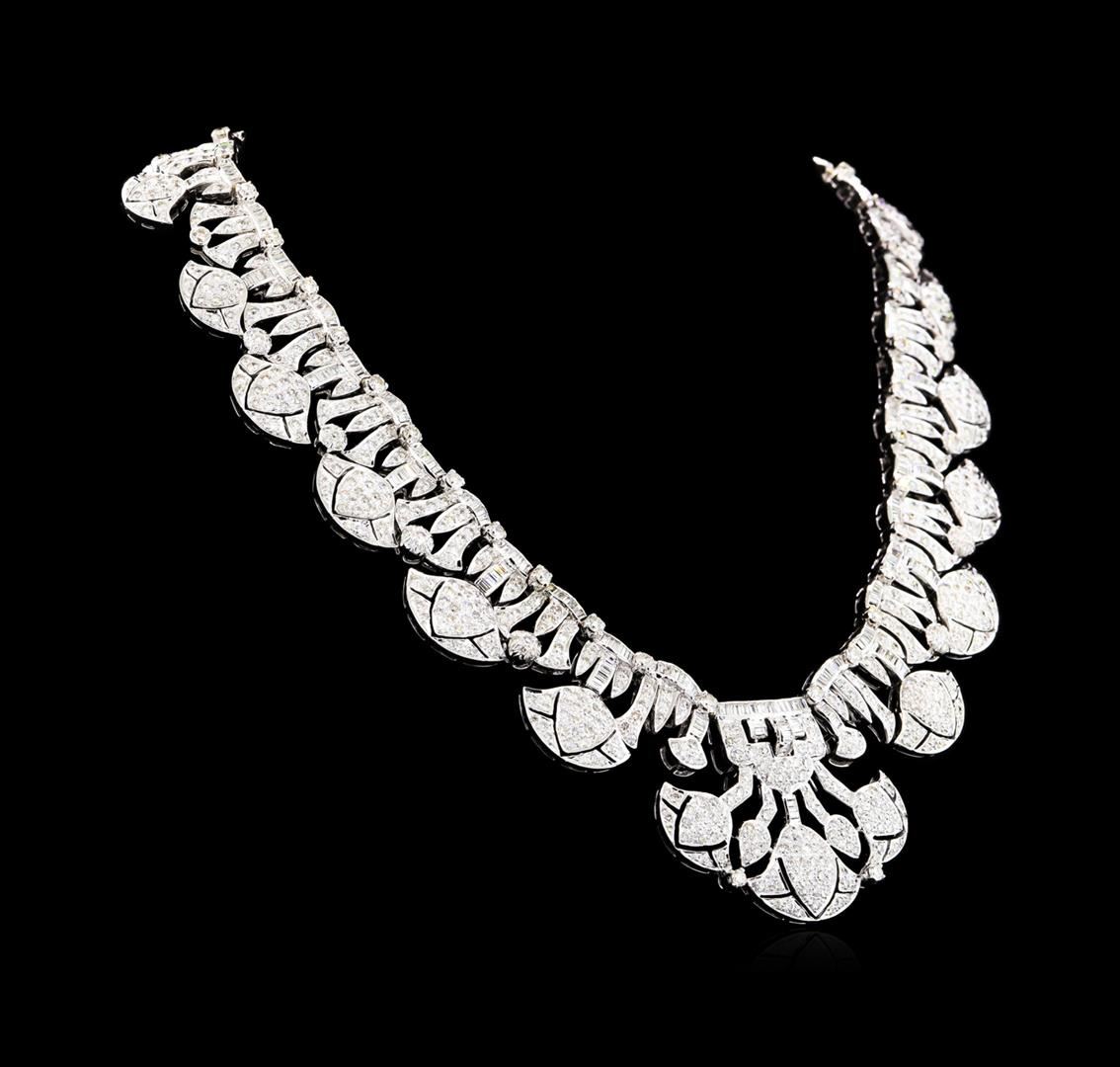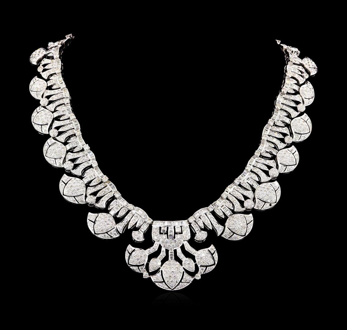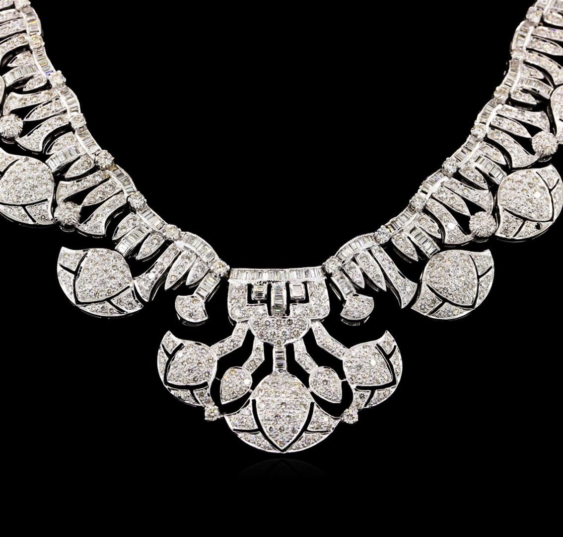 One electronically tested 18KT white gold ladies cast & assembled diamond necklace. Sixteen inch length chevron style necklace features a graduating flexible elaborate diamond ribbon with suspended diamond galleries, terminating in a concealed clasp with safety. Bright polish finish with milgrain detailing. Condition is good. Containing: Eight Hundred Eighty-Four prong set round brilliant cut diamonds approximate total weight of 884 Stones = 19.61ct. Graded in the setting. Clarity: SI-2 to I-2. Color: G - I Two Hundred Eighty-Nine channel set baguette cut (tapered) diamonds approximate total weight of 289 Stones = 4.58ct. Graded in the setting. Clarity: SI-1 to I-2. Color: G - I. Total Weight of Diamonds 24.19ct. Total Weight of Necklace141.63gm. AIG Appraised at $85,765.00.
